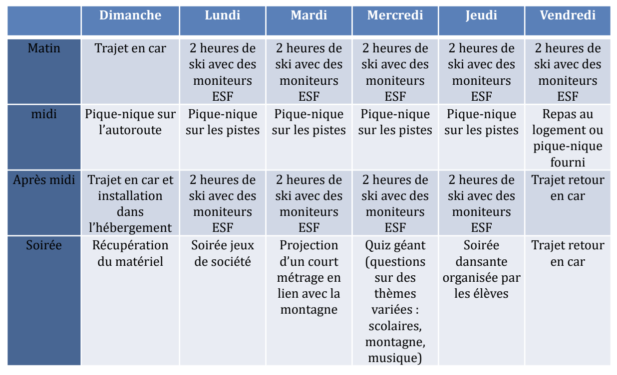 Lors de cette semaine les élèves vont pouvoir développer leur autonomie et apprendre à vivre en communauté autour de la vie tous ensemble au chalet. Ils vont aussi développer leur capacité physique par une pratique quotidienne du ski accompagné de moniteur ESF. Les soirs seront des temps consacré à la cohésion et à la découverte du milieu montagnard.