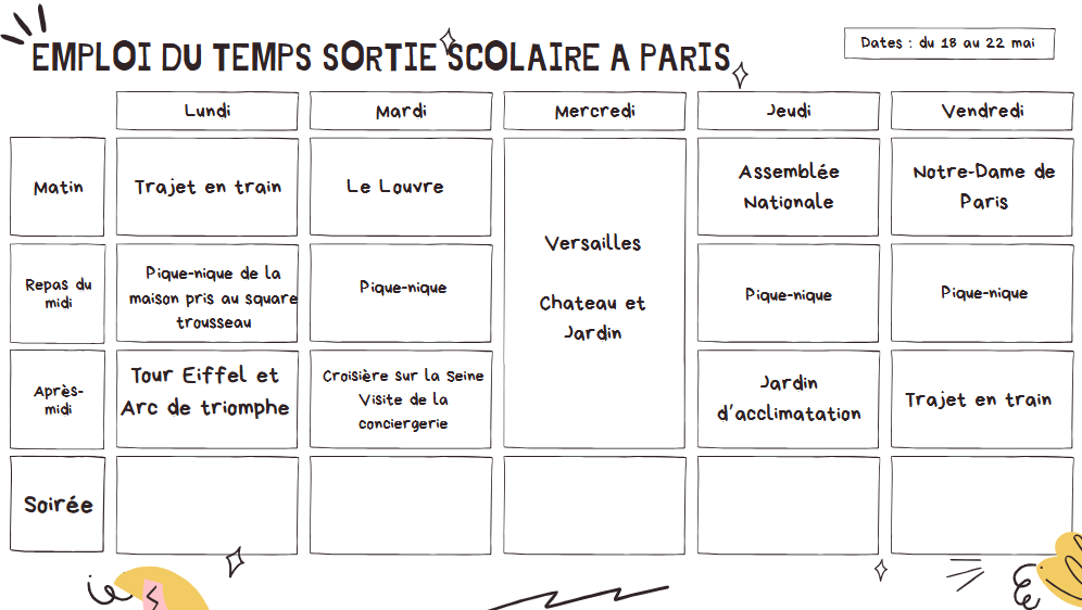 Cette sortie scolaire aura lieu du 18 au 22 mai. Nous partirons en train le lundi matin avec un programme bien chargé (Cf emploi du temps joint) : Tour Eiffel, Arc de triomphe (avec participation à la cérémonie de la flamme du soldat inconnu), Louvre, Versailles, bateaux-mouches, Notre-Dame, l'Assemblée nationale... mais également, les enfants vont découvrir les déplacements dans la grande ville (métro), les parcs...