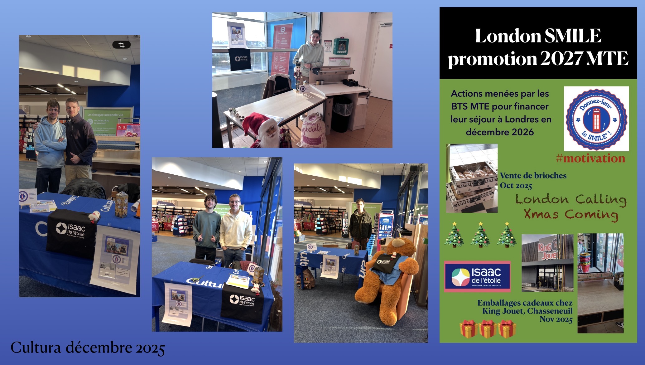 - de septembre 25 à sept 26 : montage financier par différentes actions (vente de brioches, de pâtisseries, de thés, car wash au sein de l'établissement, paquet cadeau dans les enseignes pendant les fêtes...)
