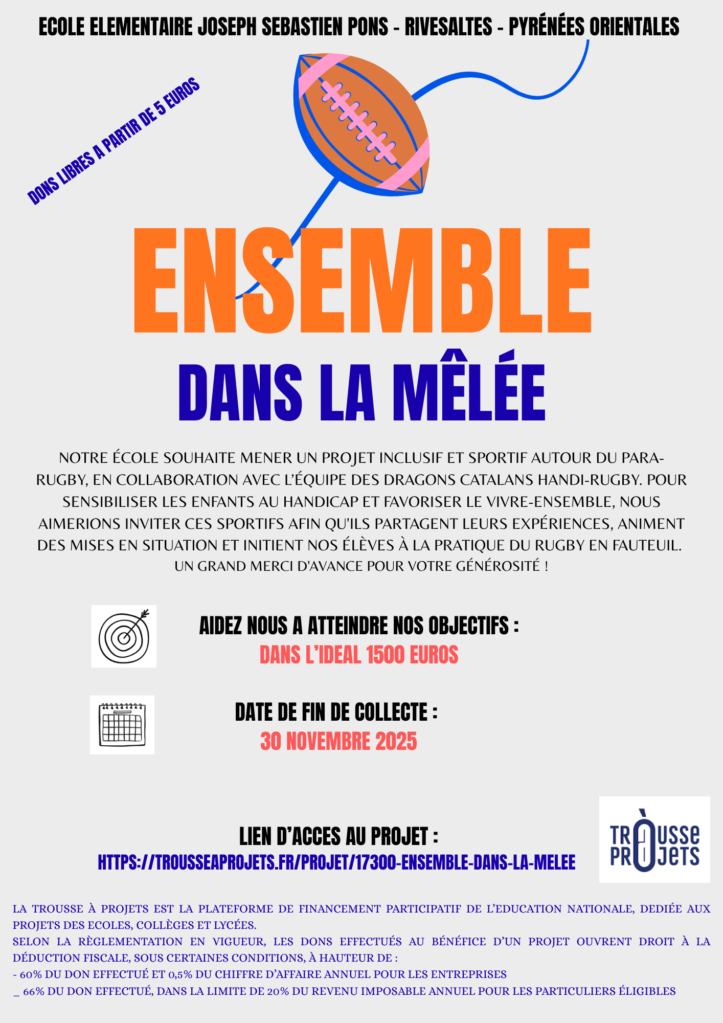 L'objectif minimum de 800 € nous permettra de financer partiellement l'intervention des joueurs.Grâce à votre soutien, nos élèves pourront vivre une expérience humaine enrichissante et partager des moments forts avec l'équipe des Handi Dragons Catalans. Chaque contribution, même modeste, nous rapproche de la réalisation de ce projet inclusif et porteur de sens. Un grand merci d'avance pour votre aide et votre générosité.