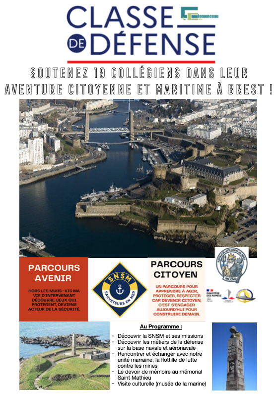 Le Collège Georges Clemenceau est un établissement classé en REP (Réseau d’Éducation Prioritaire) situé à Cerizay. Notre projet de classe défense, en partenariat avec la flottille de lutte contre les mines (LCM) de Brest, permet aux élèves de s’ouvrir à de nouveaux horizons et de développer leur sens civique.