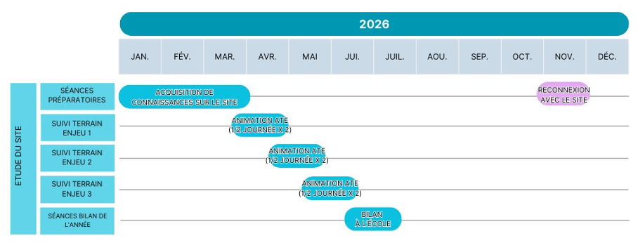 La première visite sur l’aire terrestre s’inscrivant dans la démarche permettra aux enfants de découvrir les différents milieux qui la composent (prairie, berge, rivière, arbres…). Cette visite servira d’état des lieux du site pour que les enfants puissent ensuite choisir quels sont les enjeux sur lesquels ils veulent se focaliser. Ainsi, différentes séances thématiques sur site seront menées pour réaliser des suivis qui découleront des enjeux, mobilisant une démarche d’investigation.