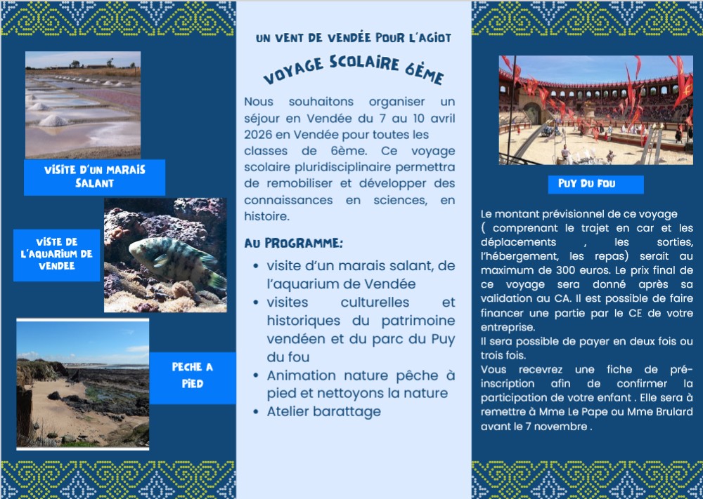 106 élèves de l'Agiot, soit TOUS les 6ème vont découvrir le littoral vendéen et pour la première fois pour certains élèves. Avec votre aide, chaque élève pourra vivre une aventure mêlant Histoire et Sciences. Nous avons à cœur de créer des souvenirs durables, apprendre à bien vivre ensemble et développer des compétences psychosociales. Cela leur permettra de faire naître la curiosité, faire grandir le savoir, savoir faire et savoir être, créer des souvenirs pour la vie.