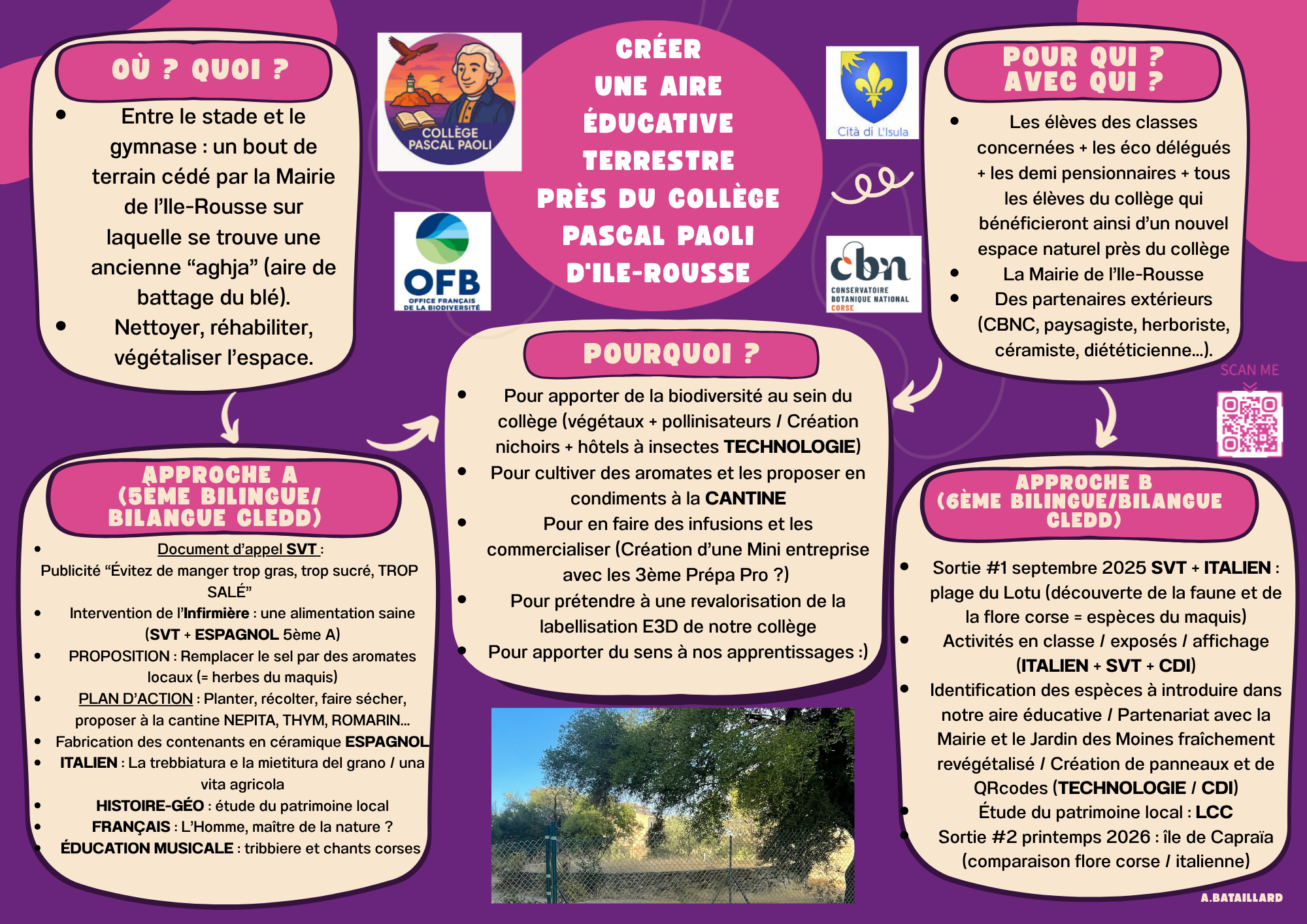 - novembre 2026 : création de fiches techniques (QR codes) + panneaux explicatifs (pour le collège mais aussi pour le