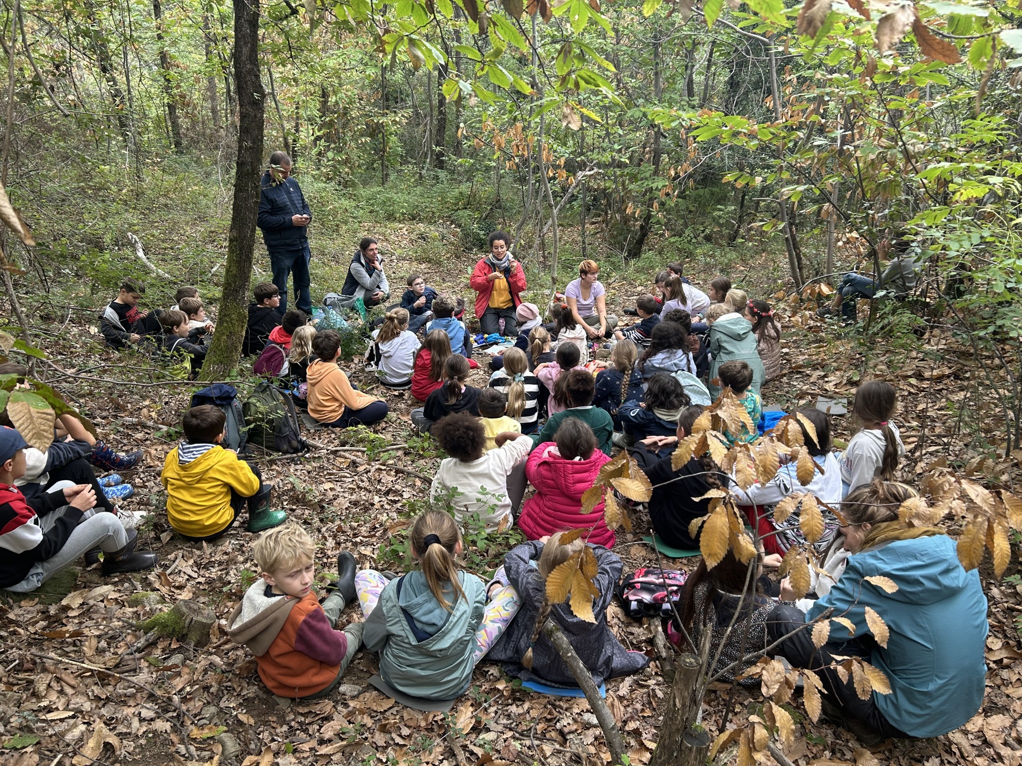 Mais nous n’avons pas encore fait d'inventaire sur les espèces vraiment là. Les arbres sont à explorer car d'autres essences se sont glissées entres les grands châtaigniers, dont certains colosse méritent le détour ; les insectes de la litière forestière également et les traces et indices de passage de mammifères. “Qu’est-ce qu'il y a au-dessus du coin d'école dehors ? Qui vit ici ? ” Nous sommes loin d'avoir exploré toute la parcelle et les élèves n'attendent que ça. Ils se questionnent aussi sur qui utilise réellement ce sentier informel ? Mme Bruno s'interroge aussi sur l'usage de ce sentier et nous pourrions travailler avec elle sur la signalisation en faisant des pancartes pour préciser à qui appartient cette parcelle et quels en sont les usages.