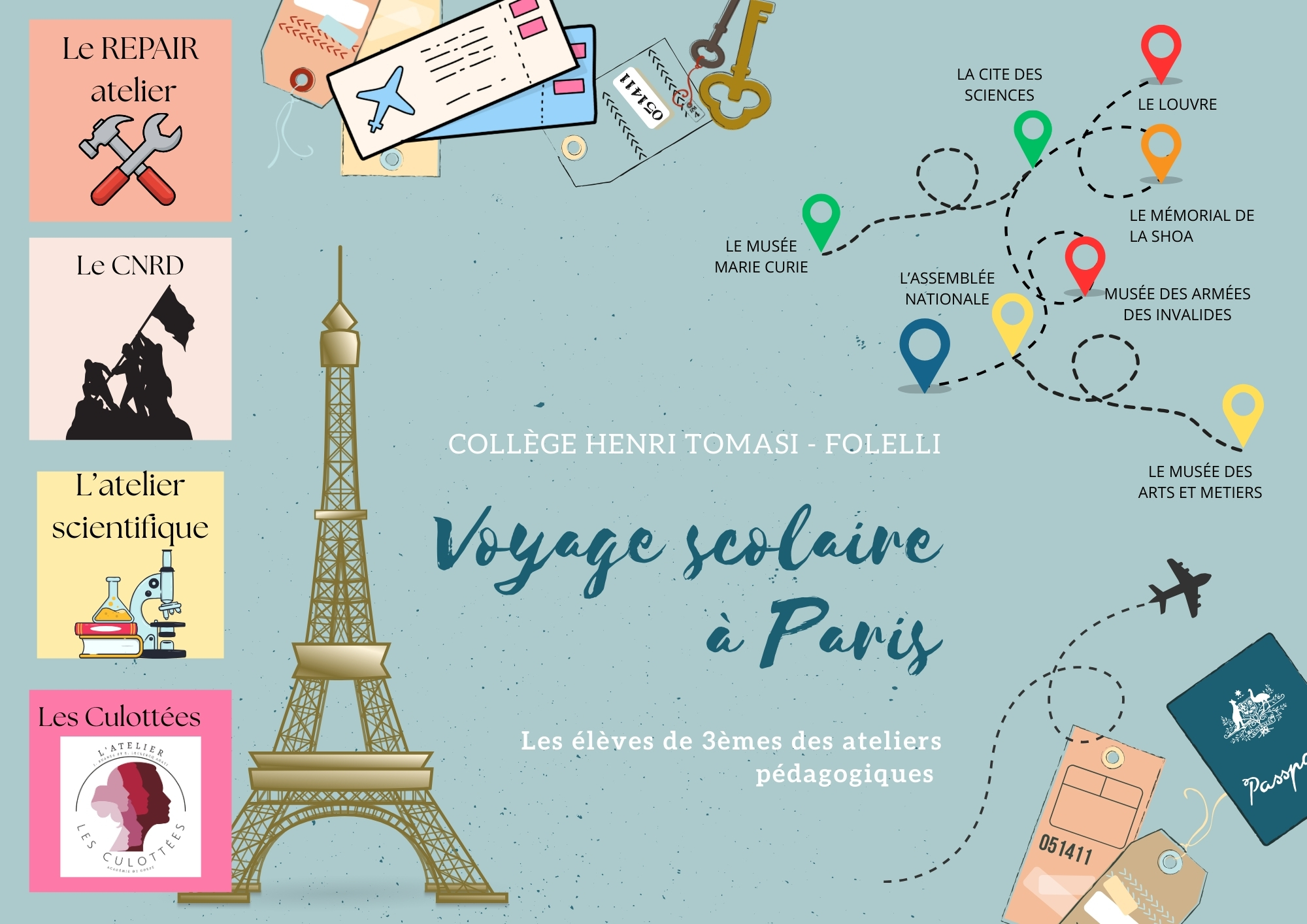 Il s'agit d'un voyage à Paris prévu pour le printemps 2026, axé sur les sciences et l'histoire. L'objectif est de faire découvrir les lieux emblématiques de la capitale dans le but d'enrichir leur culture, d'éveiller leur curiosité, de développer leur esprit critique et leur engagement citoyen.