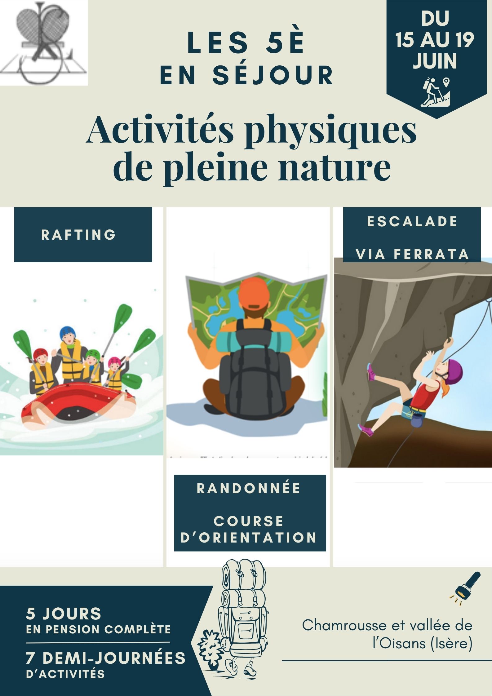 Le projet consiste à permettre à 31 élèves de 5ème de pouvoir participer à un séjour sportif, sur la thématique des activités physiques de pleine nature (APPN) à Chamrousse.
