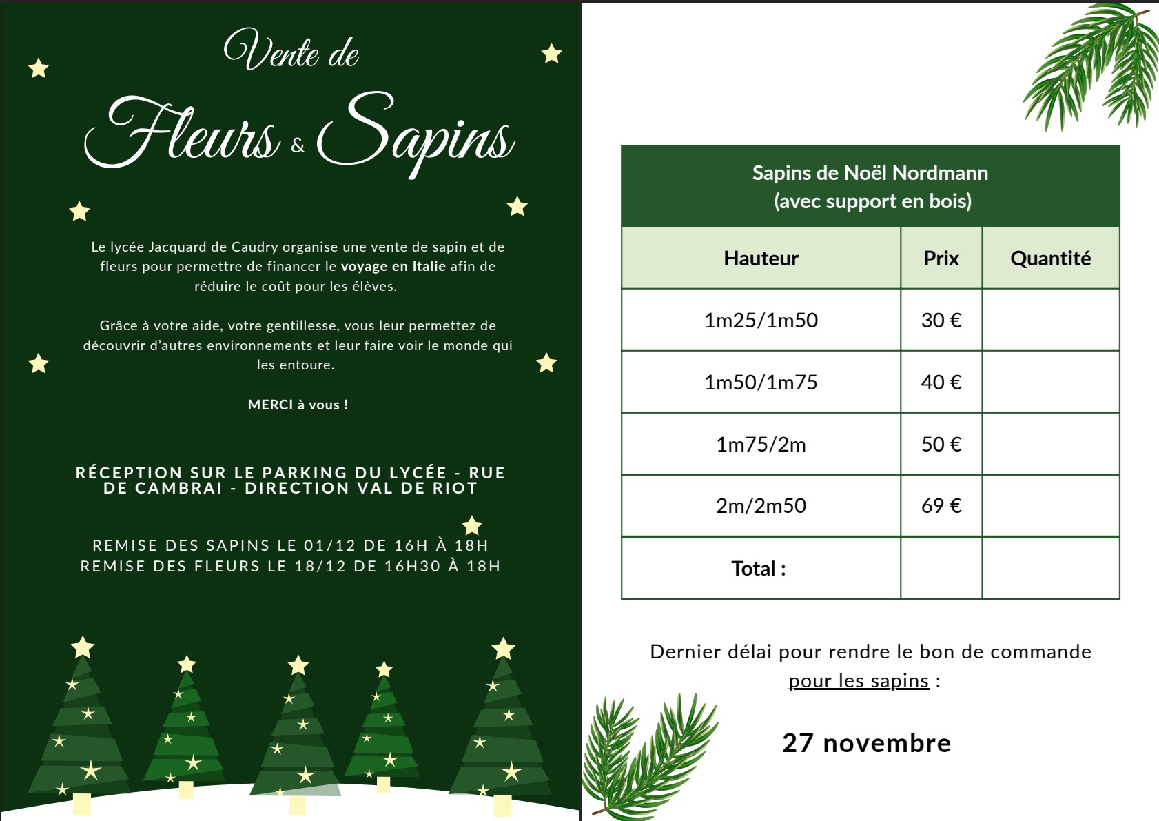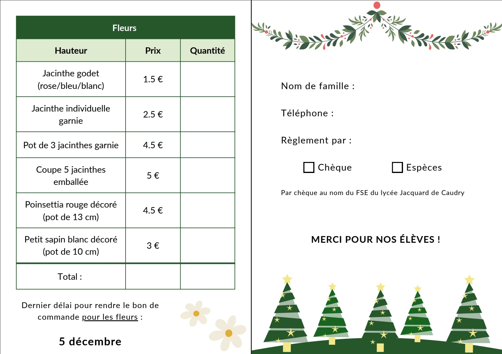 Les règlements doivent être adressés à l'ordre du F.S.E. du lycée Jacquard de Caudry avant le 27 novembre (pour les sapins) et le 5 décembre (pour les fleurs).