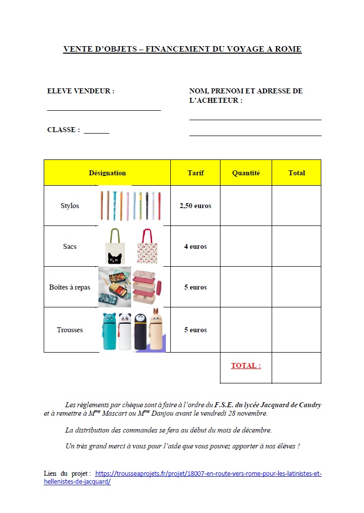 Des objets (stylos, sacs, boîtes à repas et trousses) sont mis en vente par les élèves au profit du voyage à Rome.