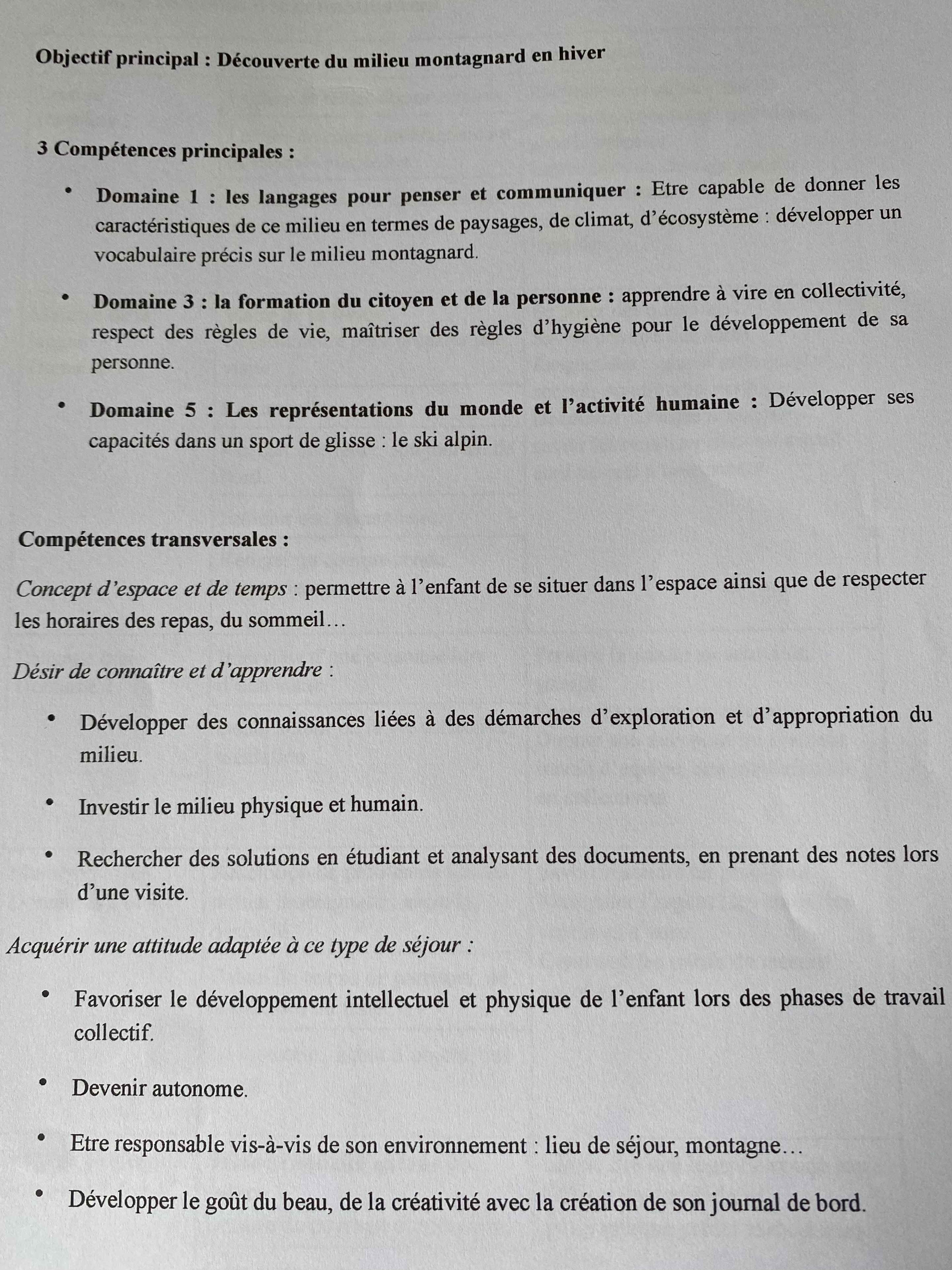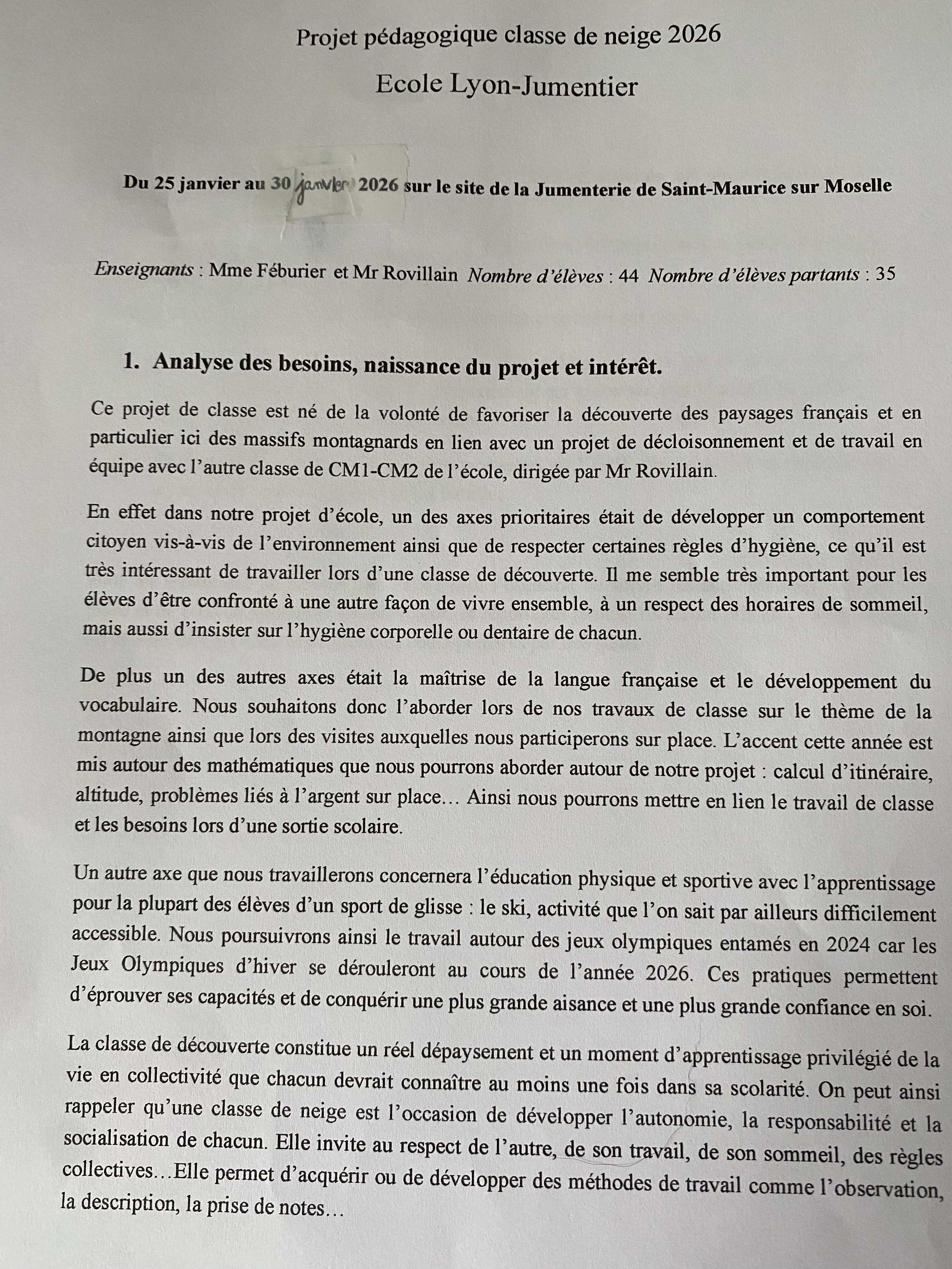 Nous souhaitons partir fin janvier du 25 au 30 pour 6 ou 7 jours selon l’aide accordée à Saint Maurice sur Moselle dans les Vosges sur le site de la Jumenterie. Le programme sera donc axé sur la pratique du ski alpin (4 séances seraient idéales pour voir les élèves progresser), nous avons également un projet autour des métiers liés à la montagne avec la visite d’un artisan fabricant de jouets en bois et d’une ferme avec fabrication artisanale de munster et barkass fromages locaux.