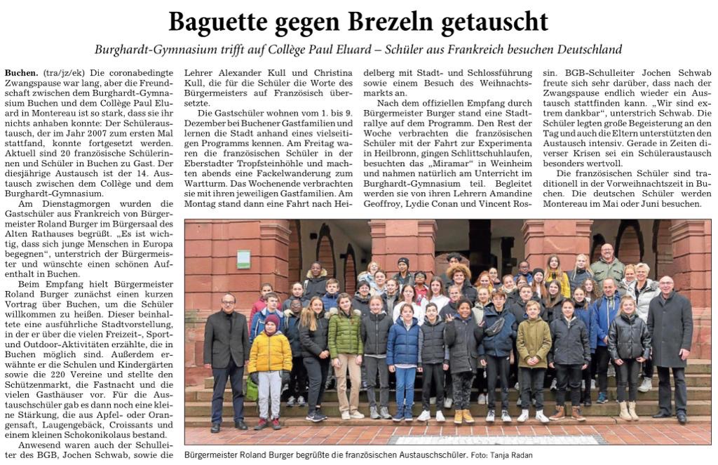 Les jeunes Français sont accueillis huit jours, fin novembre - début décembre, dans les familles allemandes et nous accueillons, en retour, les Allemands début mai. Les correspondances entre élèves, qui prennent diverses formes (courrier, e-mail, ou encore messages instantanés) débutent courant octobre et perdurent jusqu'au retour des Allemands au mois de mai, et parfois plus.