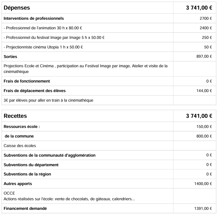 L'objectif minimum de 2750 € nous permettra L'objectif minimum de 2750€ permet de rémunérer le professionnel de l'animation (2650€) et le projectionniste (100€) qui diffusera notre film d'animation dans notre cinéma de secteur. Ce projet se distingue par son approche exhaustive du cinéma d'animation, englobant la création pratique, l'étude des