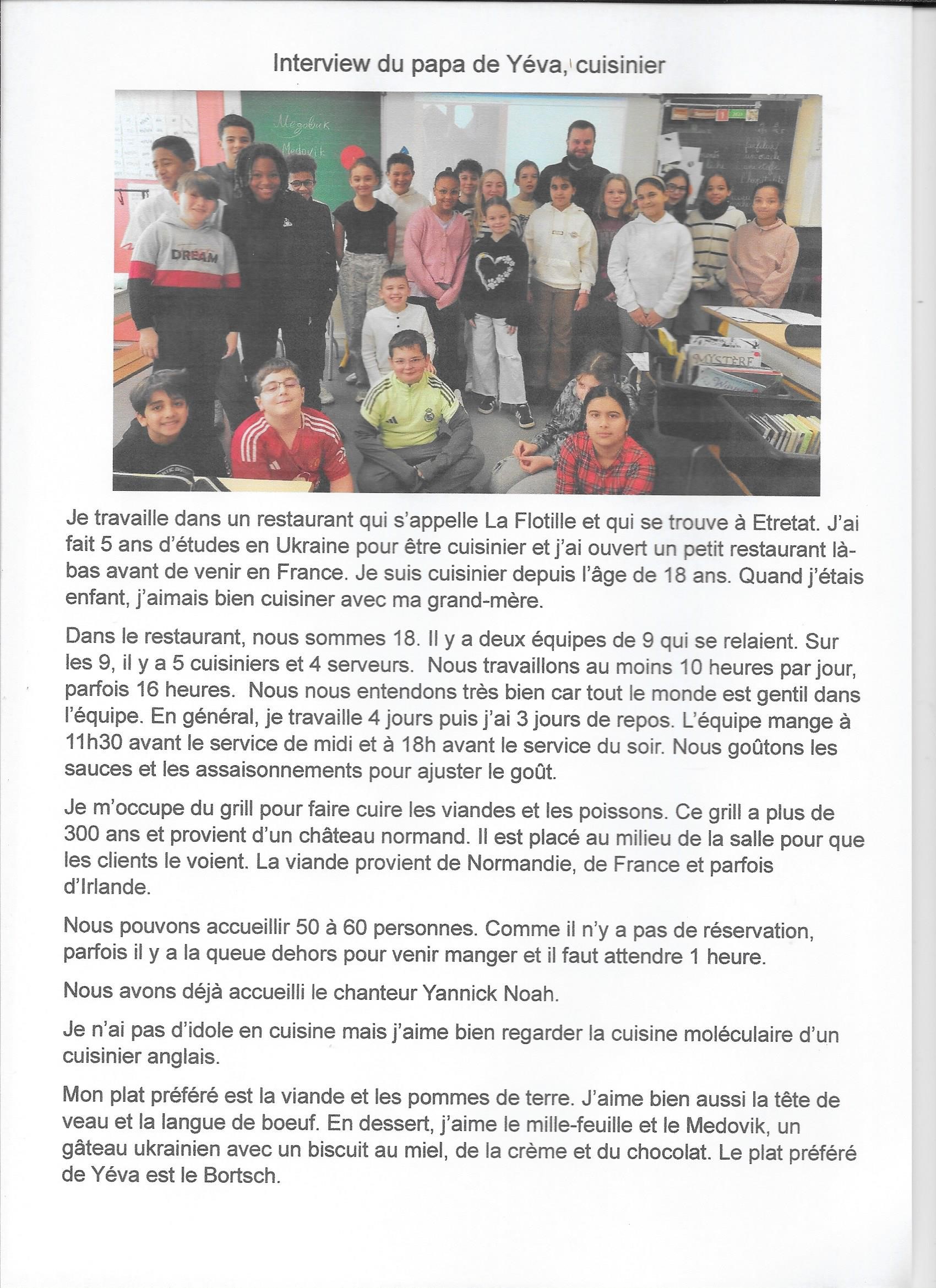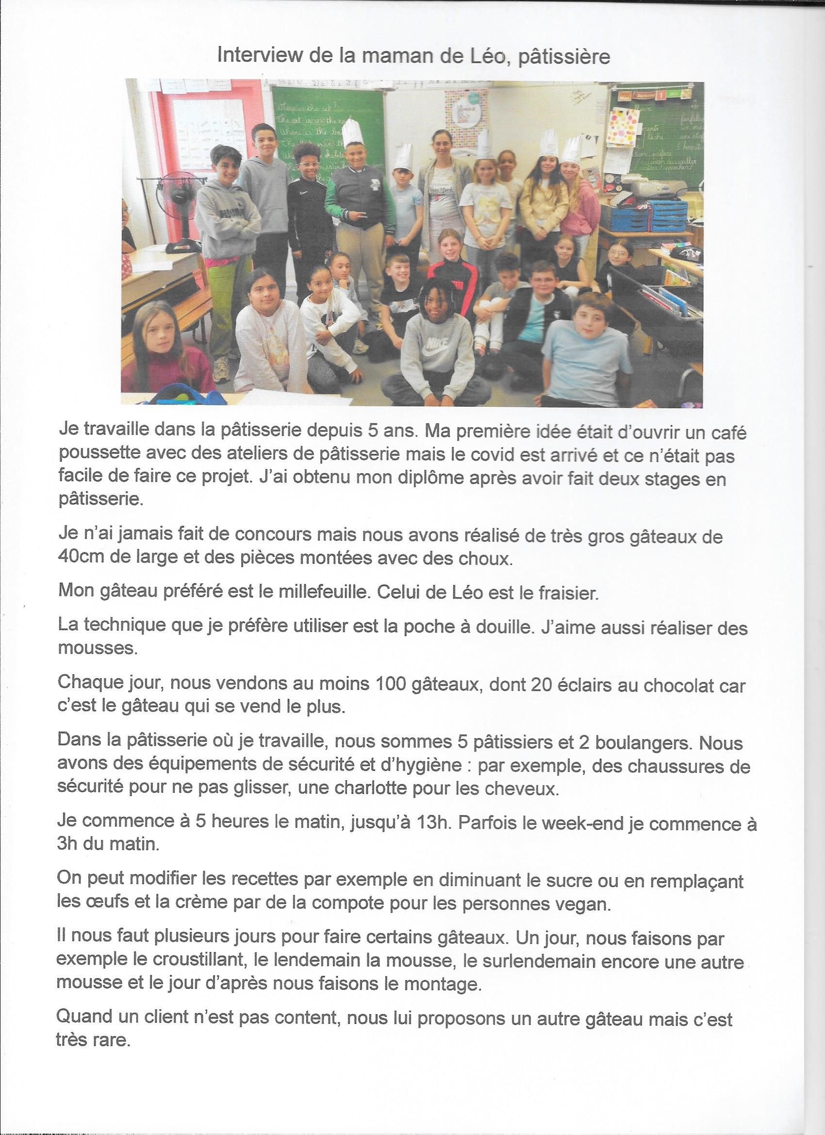- une interview de deux parents d’élèves de la classe : l’une pâtissière, l’autre restaurateur sur les métiers liés à l’alimentation.