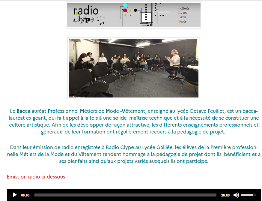 Site du Lycée Octave Feuillet Nous sommes un établissement public professionnel qui accueille des élèves, dont un certain nombre à besoins particuliers, du CAP au Baccalauréat Professionnel et Brevet des Métiers d'Art. Avec la rénovation de la voie professionnelle ces élèves sont confrontés à de nombreuses épreuves orales qui demandent toutes des capacités oratoires, des aptitudes de synthèse de l'information et de médiation. Avoir une webradio au sein de l'établissement permettrait de les y aider grandement. L'expérience à Radio Clype a été très positive et a permis d'améliorer les résultats au CCF en anglais. Nous aimerions également développer l'expérience en français.