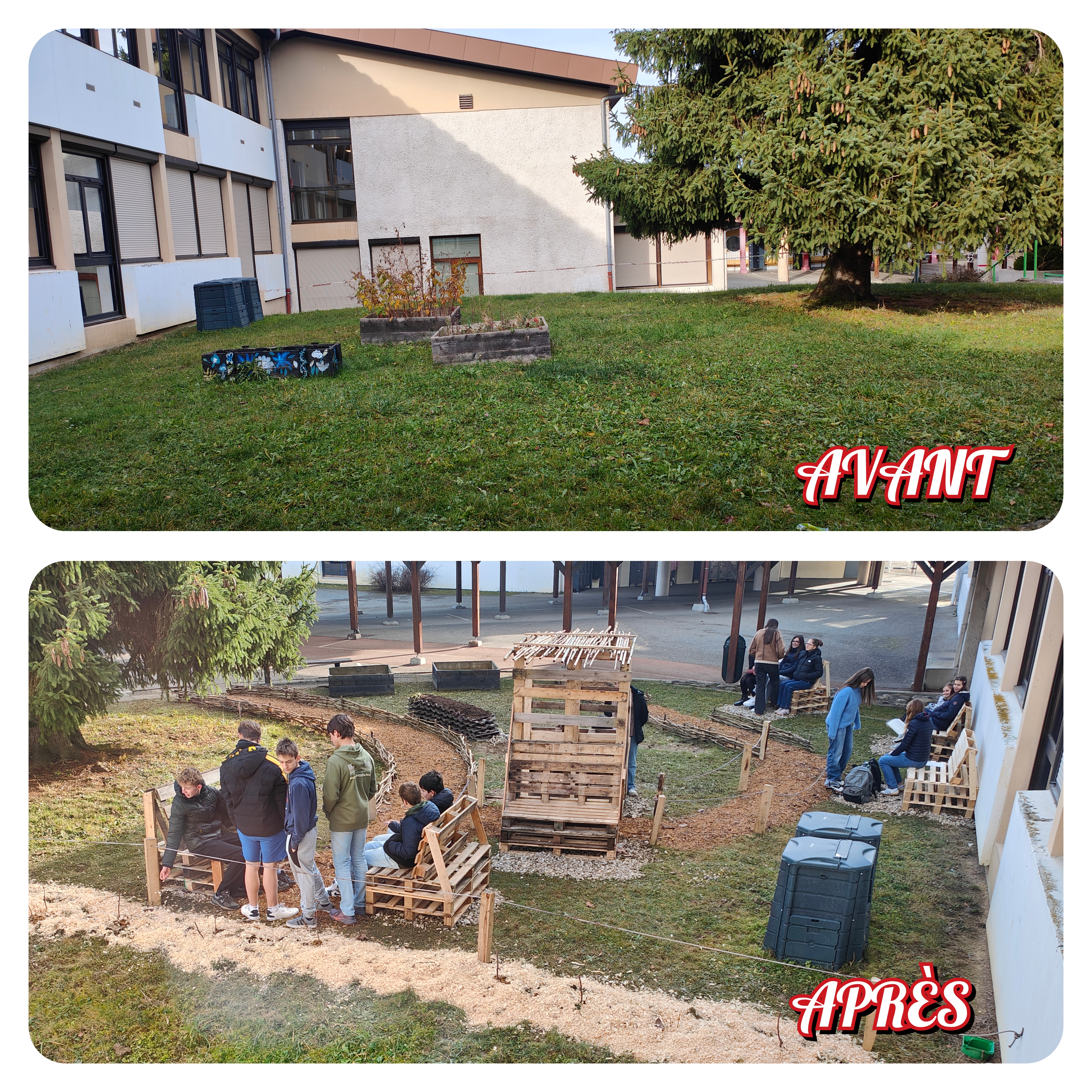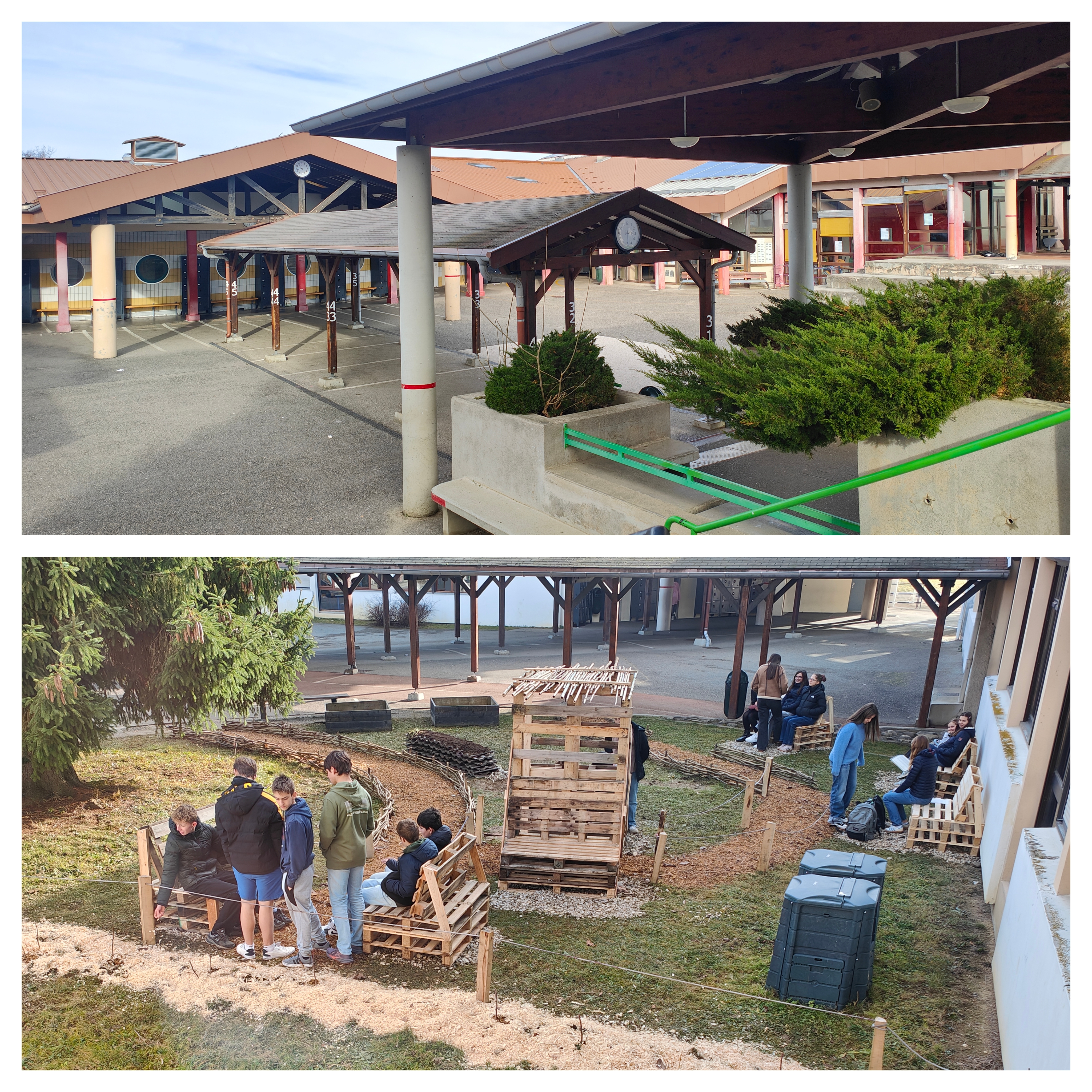 Notre collège, niché au pied des montagnes, bénéficie d’un cadre naturel exceptionnel ; néanmoins notre cour, très bitumée, offre peu d’espaces accueillants pour les élèves et la biodiversité. Ce constat nous a poussés à agir afin de donner plus de vie à notre cour.