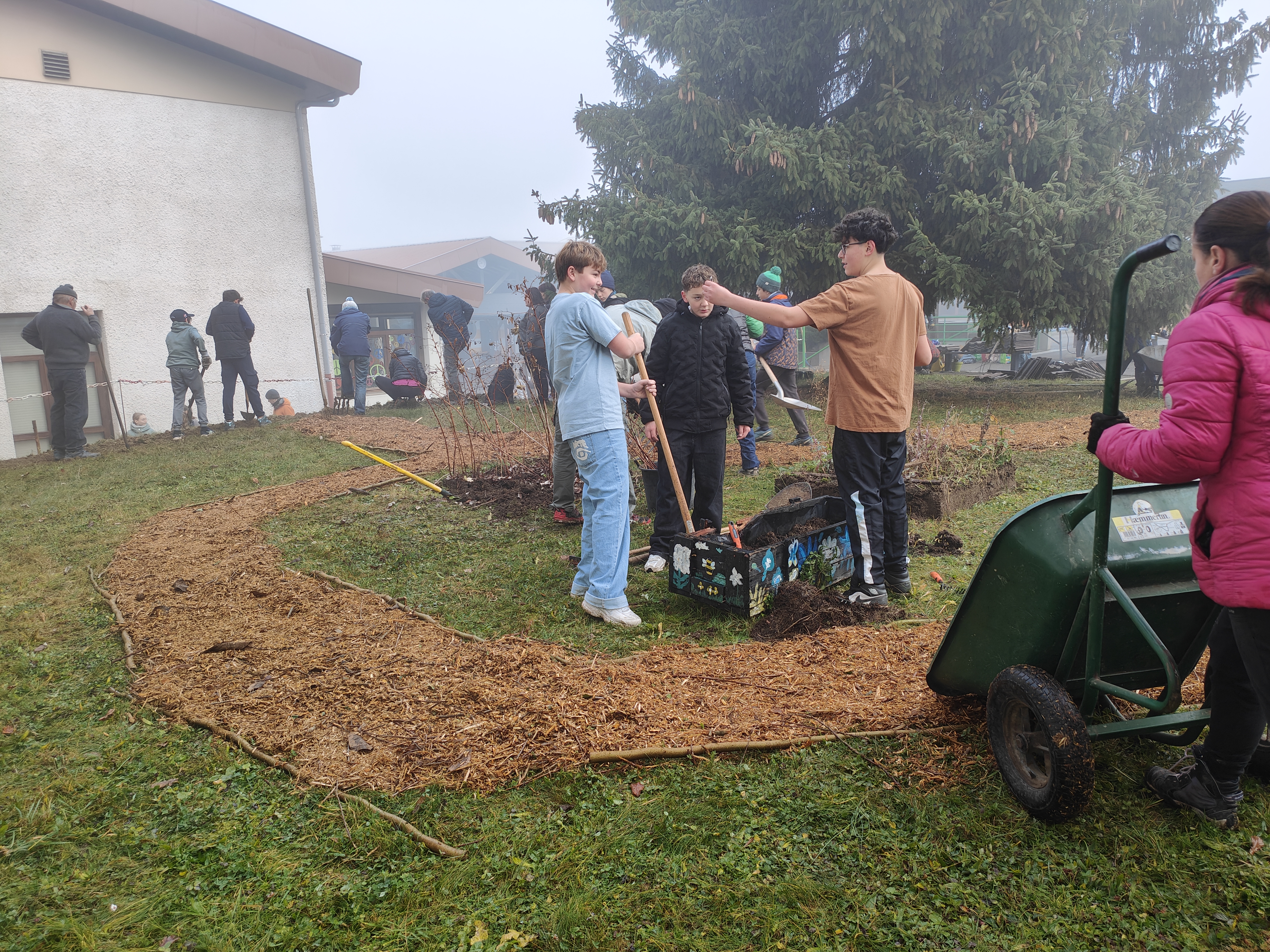 Tout a commencé aux alentours de neuf heures. Une cinquantaine de personnes se sont mobilisées dont de nombreux élèves ! Des parents ont apporté des palettes, des copeaux, des cordes, des tuiles, des bambous, des boutures ainsi que de nombreux outils dans le but d’aménager un coin non exploité de la cour. Un écologue investi sur le projet nous a aussi conseillés pour réaliser ce premier chantier. Vissage, ponçage, bricolage, jardinage, tressage de branchages : voilà que le projet avance et prend forme. La petite armée de travailleurs oeuvre, chacun à son poste ! Sans oublier une petite pause goûter pour les plus gourmands ! Au bout de quatre heures d’un travail intense et convivial, des banquettes, de jolis sentiers, une charmante haie composée de différents végétaux et une spirale ornée de fraisiers sont nés. Quelle satisfaction collective devant le pari remporté ! Nous remercions vivement tous ceux et toutes celles qui ont généreusement donné de leur temps pour que le projet prenne vie ! Les liens entre les membres de la communauté éducative s’en trouvent renforcés et ce, pour le bien-être de nos collégiens et collégiennes d’aujourd’hui et de demain.