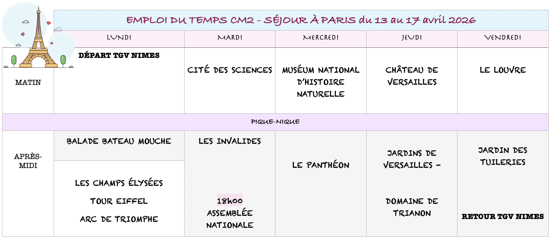Le séjour aura lieu du lundi 13 au vendredi 17 avril. Le trajet se fera en TGV, départ le lundi matin et retour le vendredi en fin de journée. Un programme riche et bien chargé accompagne nos souhaits : Balade en bateau mouche et découverte des monuments emblématiques de la ville comme la Tour Eiffel, Arc de triomphe, de nombreuses visites comme le Louvre, Versailles, le Panthéon, les Invalides, la cités des sciences et un rendez vous avec le député pour une découverte de l’Assemblée nationale… les enfants découvriront également le métro et les déplacements dans la grande ville. Nous vous partageons notre emploi du temps (cf document) !