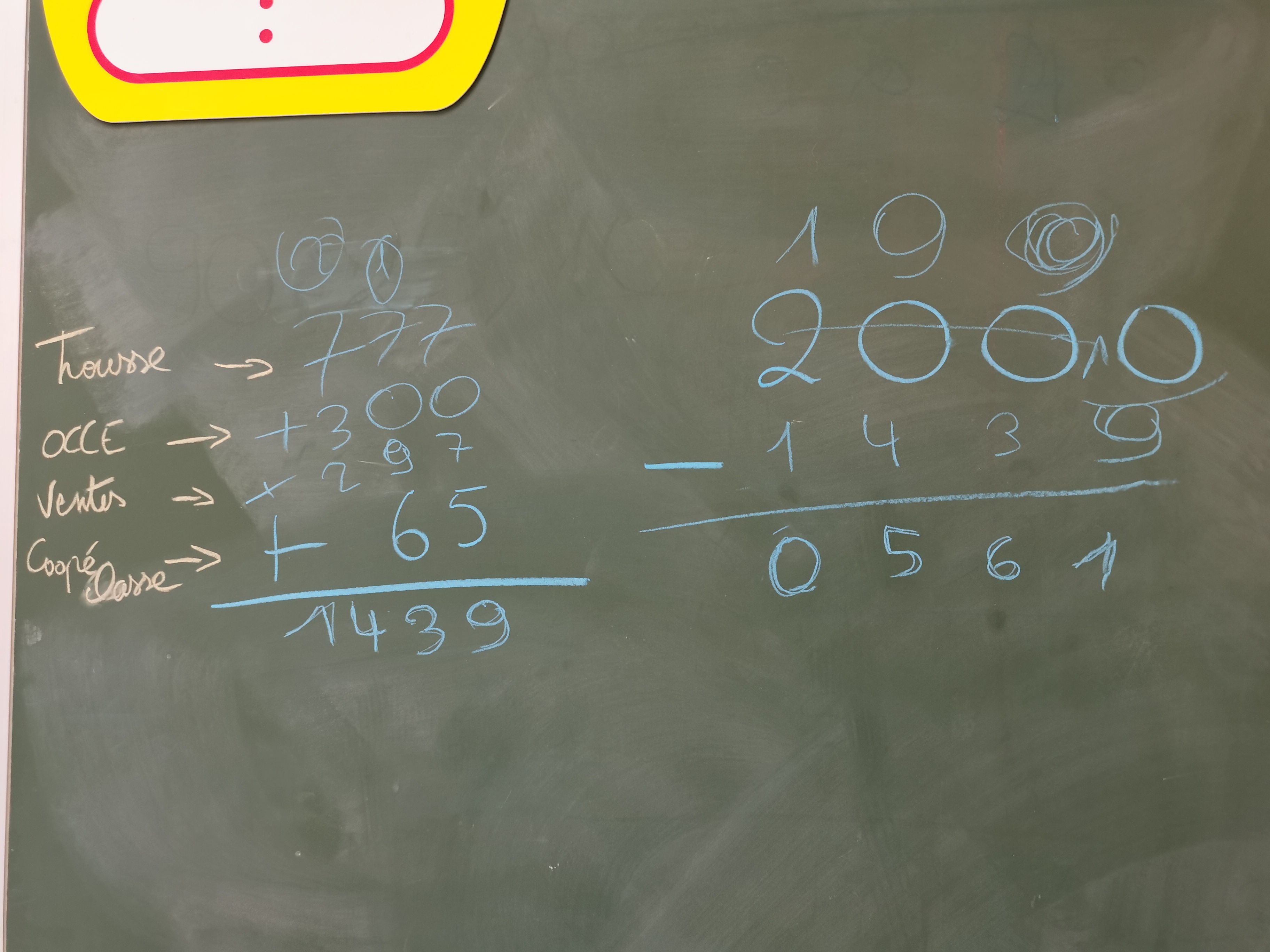 il y a les 777€ de la Trousse à Projets, les 300€ de l'OCCE, les 297€ de ventes de l'école et 65€ de la coopérative de notre classe. Il nous manque encore 561€ pour atteindre le seuil de 2000€.