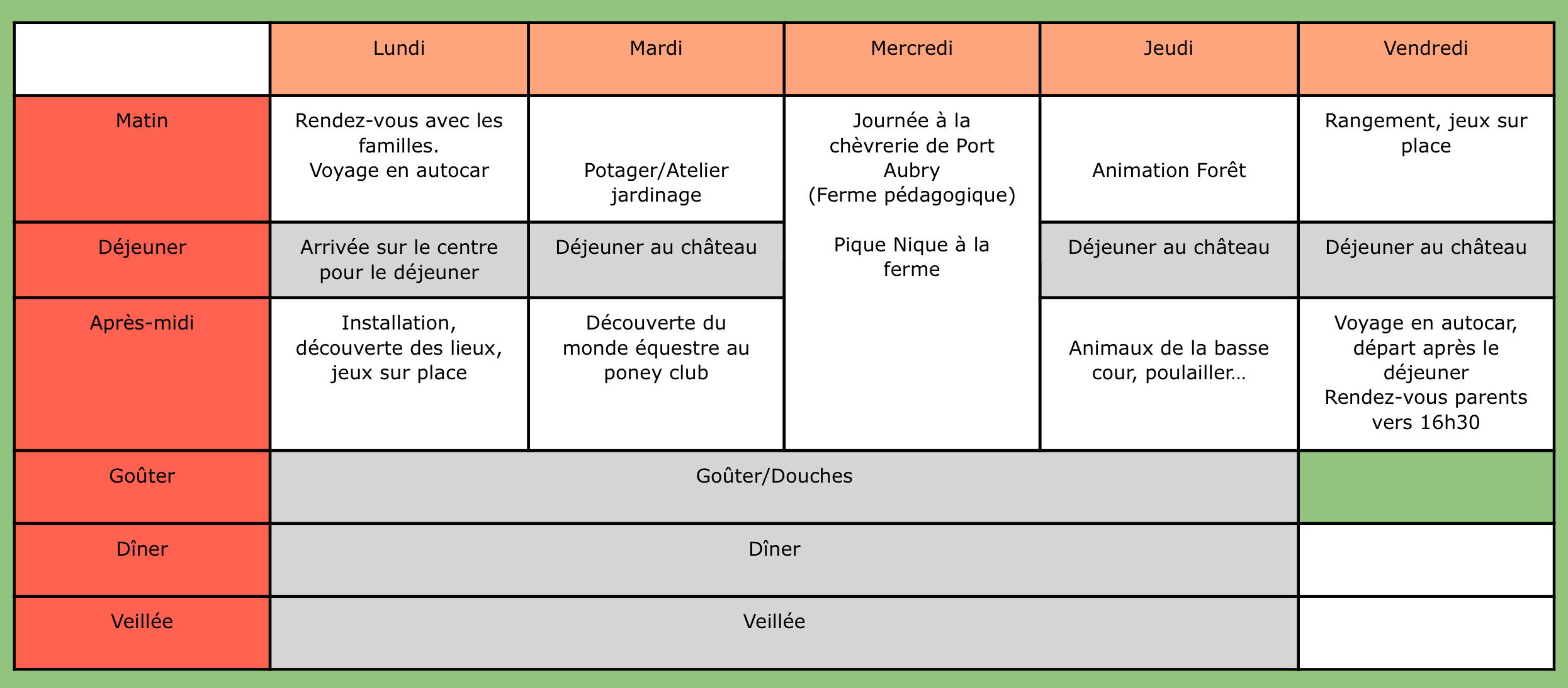 Ce séjour de cinq jours permettra aux enfants de s’approprier de nouvelles notions, à travers le vécu, la manipulation et l’immersion dans un environnement naturel, sécurisant et propice à l’apprentissage.