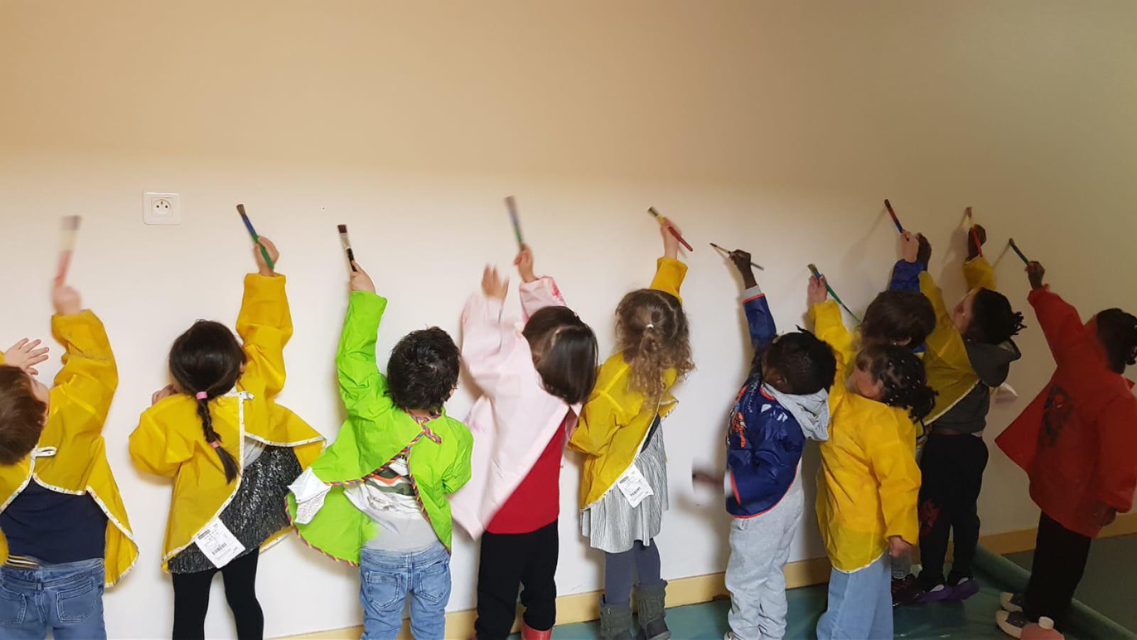 Les petits créeront le fond de la fresque en expérimentant différentes matières et techniques pour découvrir le plaisir d’explorer, de toucher, d’essayer.