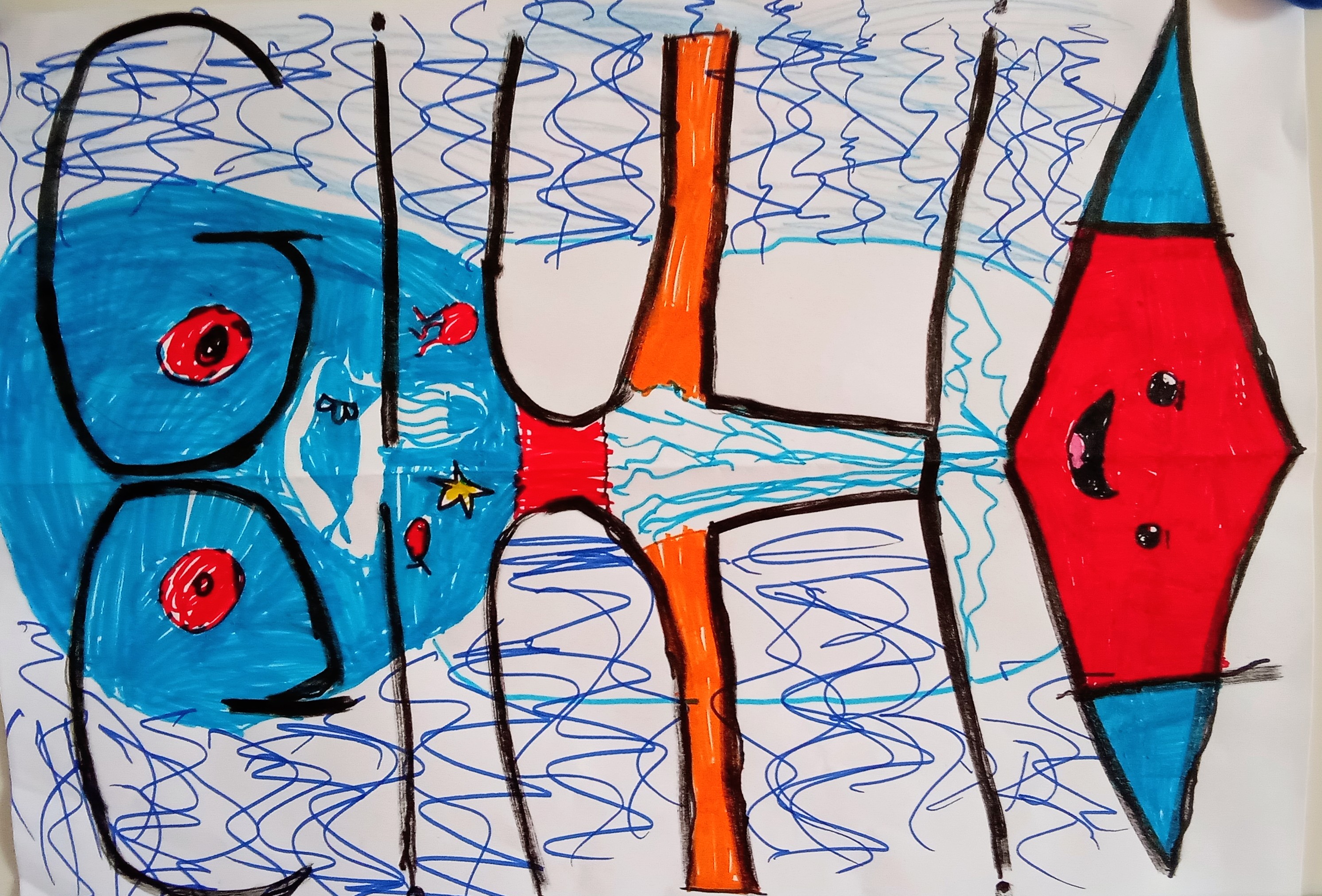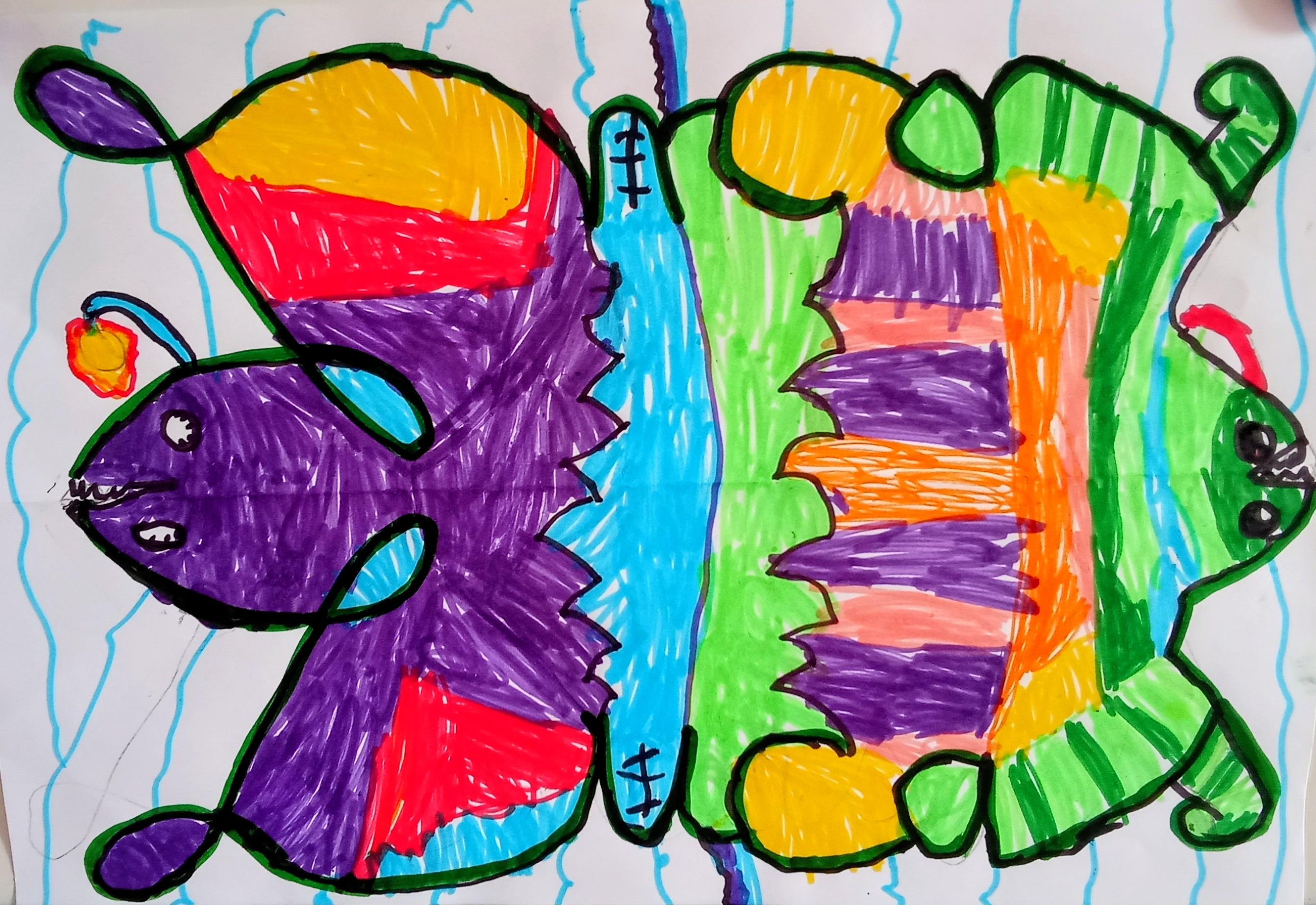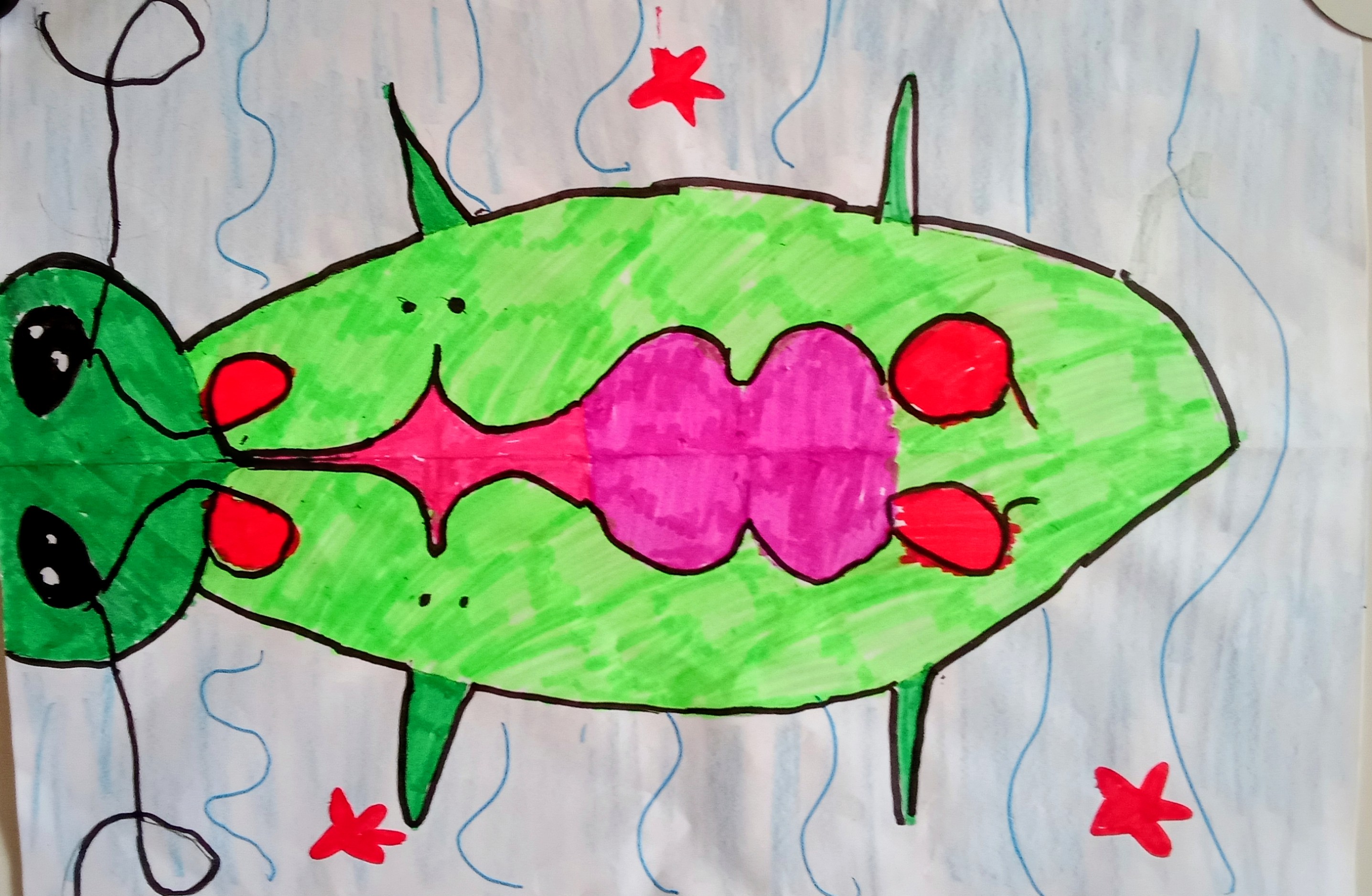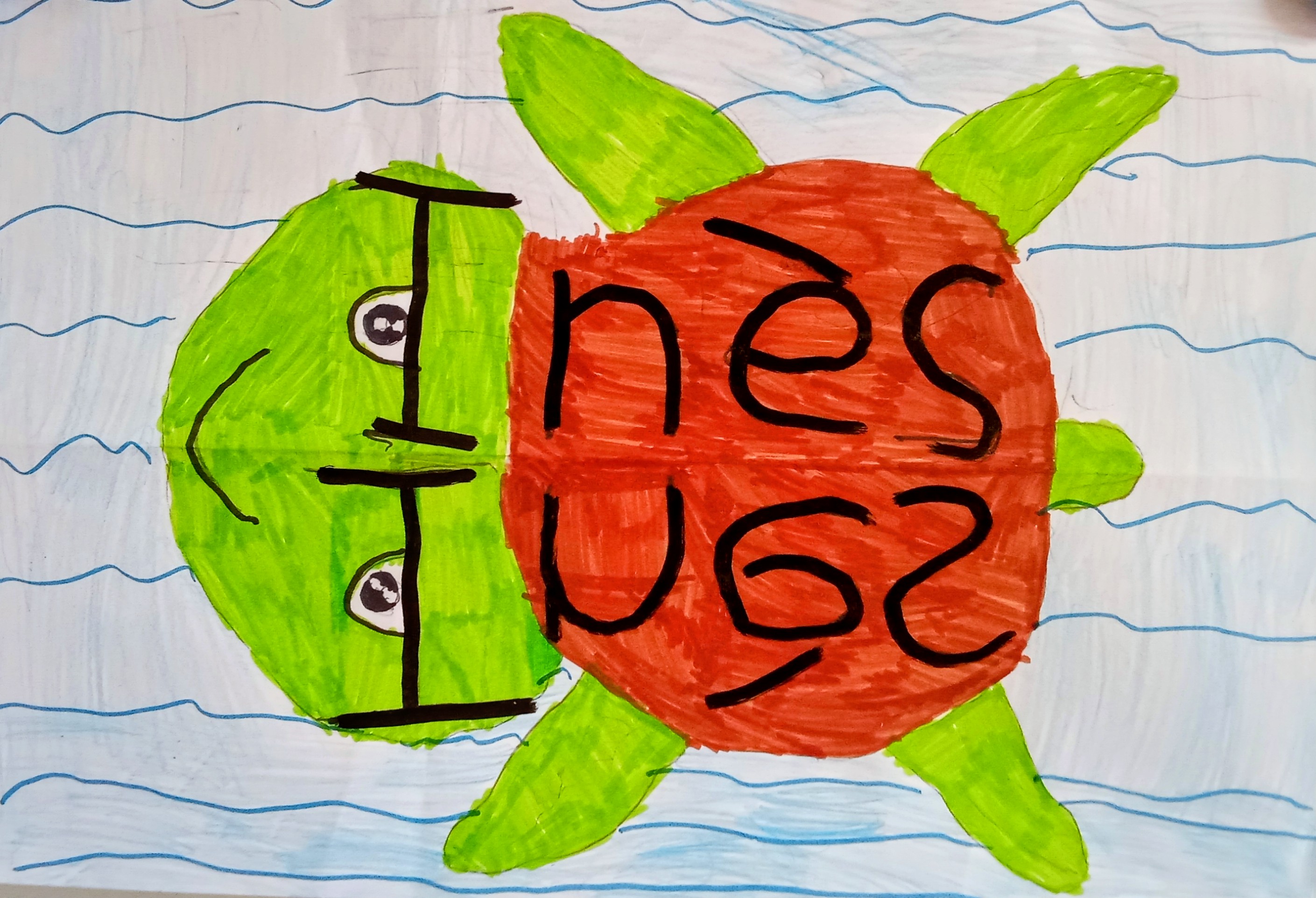 Pour nous présenter, nous avons écrit nos prénoms en symétrie puis avons imaginé un être vivant lié à l'océan. Nous avons enregistré notre présentation en anglais pour demander à nos correspondants leurs prénoms.