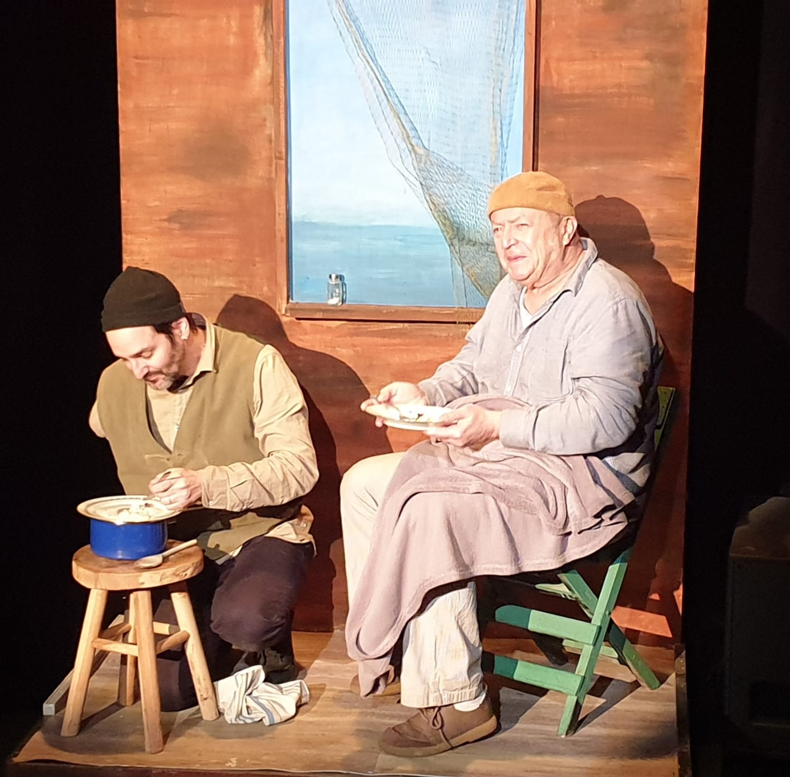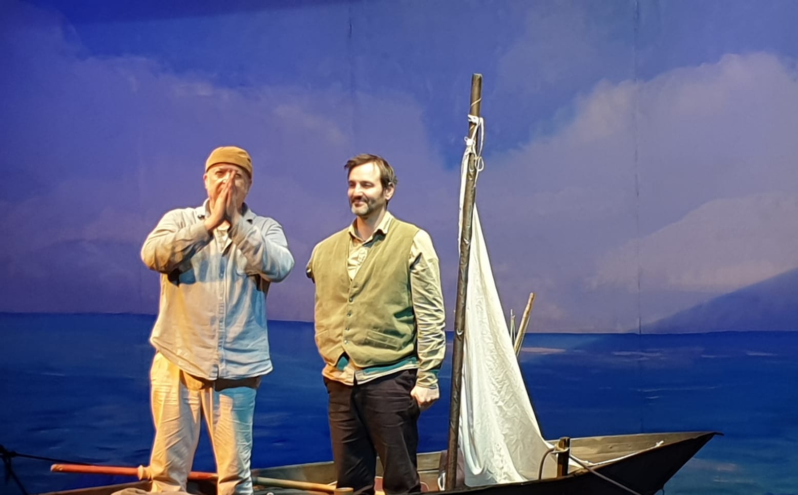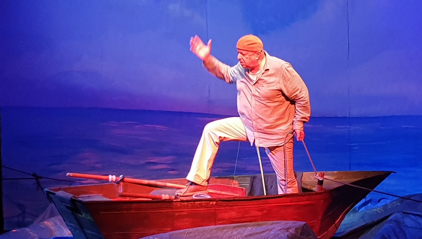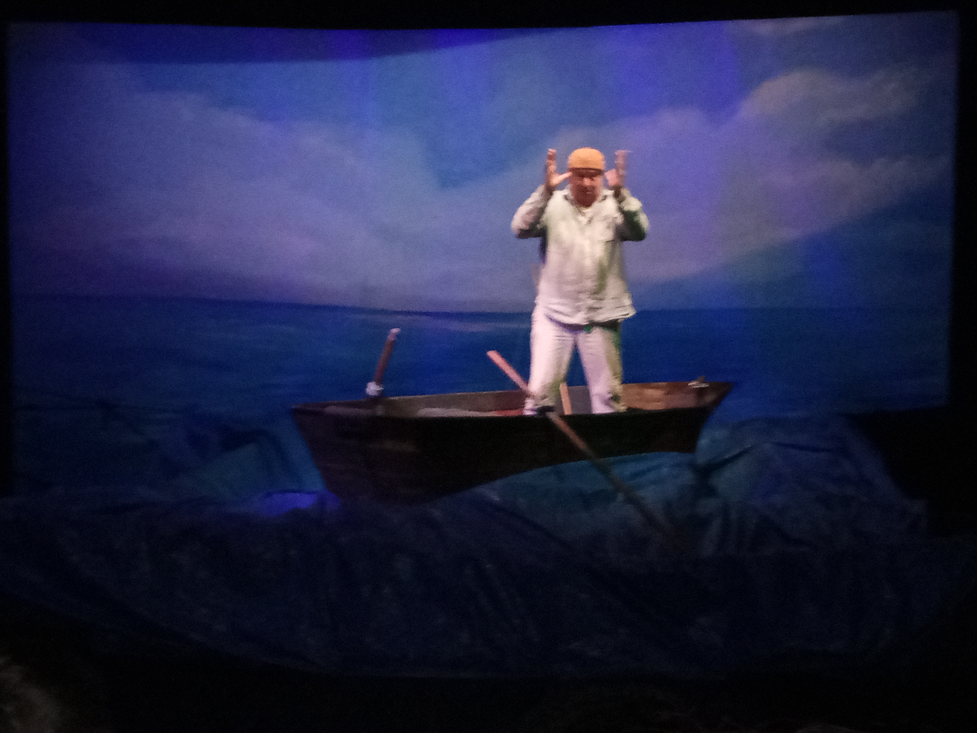 Il y avait deux comédiens. Santiago , le vieux pêcheur , comme attendu, était souvent seul sur sa barque. Il changeait régulièrement de places et de positions. On a retrouvé les extraits lus en classe. C’était bizarre...