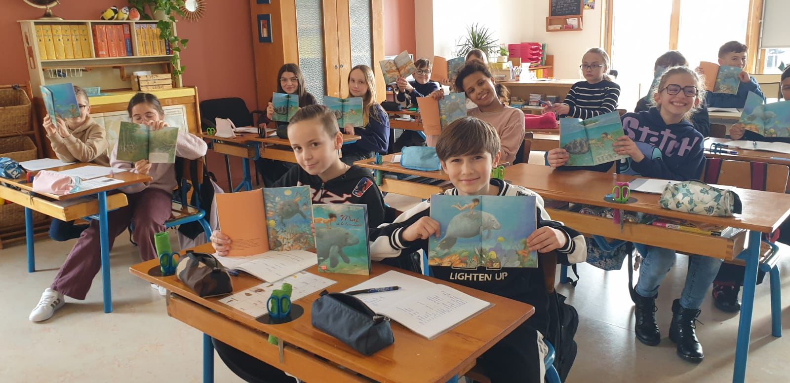 Grâce à la lecture de Maé et le Lamentin, les élèves découvrent des espèces marines du Pacifique.