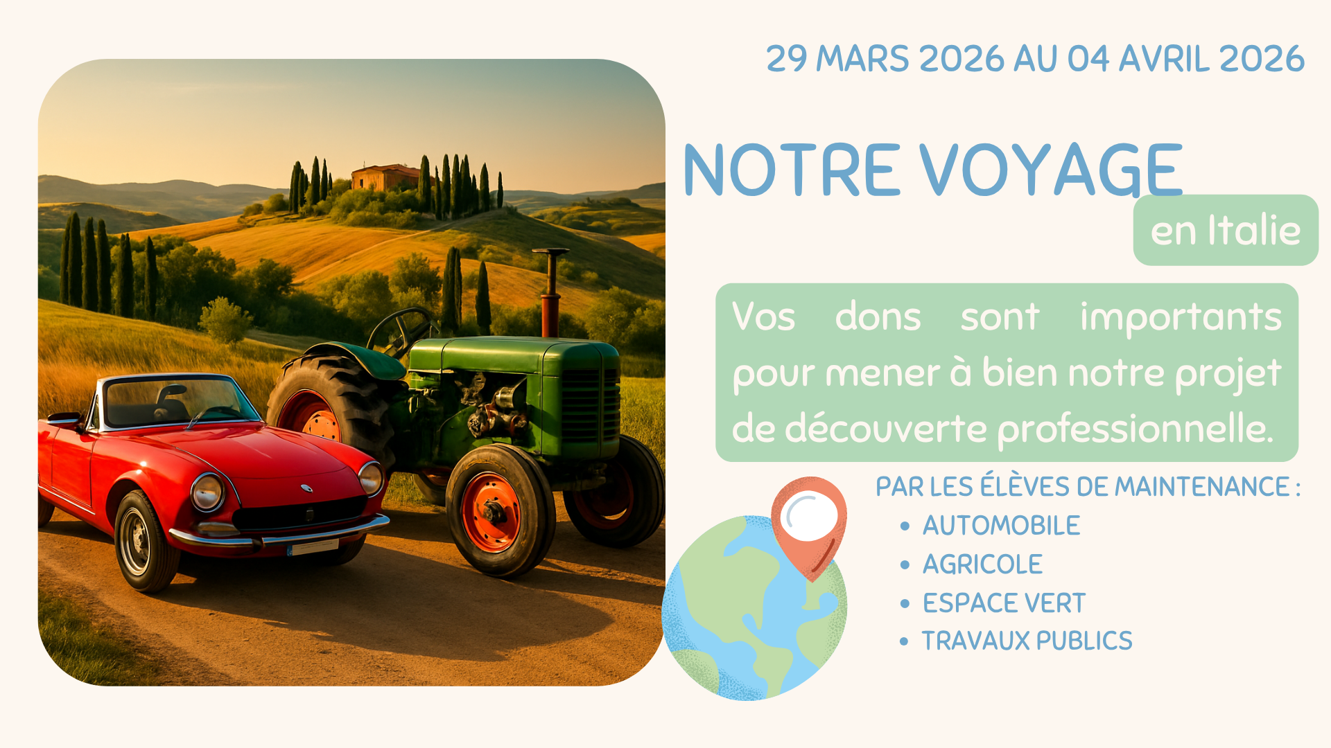 Soutenez 49 élèves de Maintenance Automobile, Agricole, Espace Vert et Travaux Publics pour découvrir l'Italie et ses nombreuses usines de production automobiles et de machinisme.