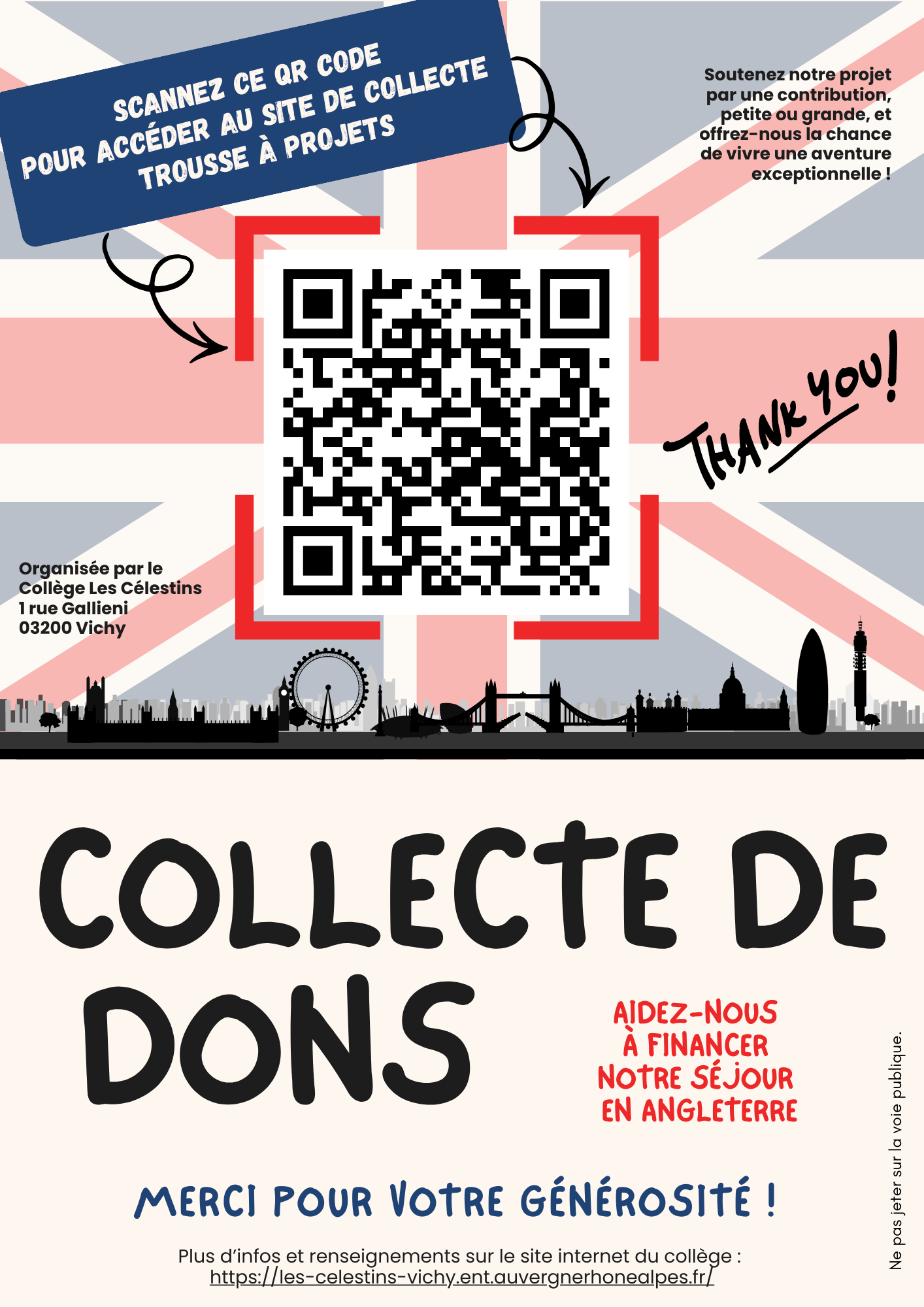 Si le programme est très dense, le voyage a cependant un coût de 479€ par élève et nous souhaiterions aider nos familles à financer ce départ. Pour cela, nos professeurs ont mis en place une collecte de dons sur le site sécurisé Trousse à projets dont voici l’adresse : https://trousseaprojets.fr/projet/19064-angleterre-nous-voila