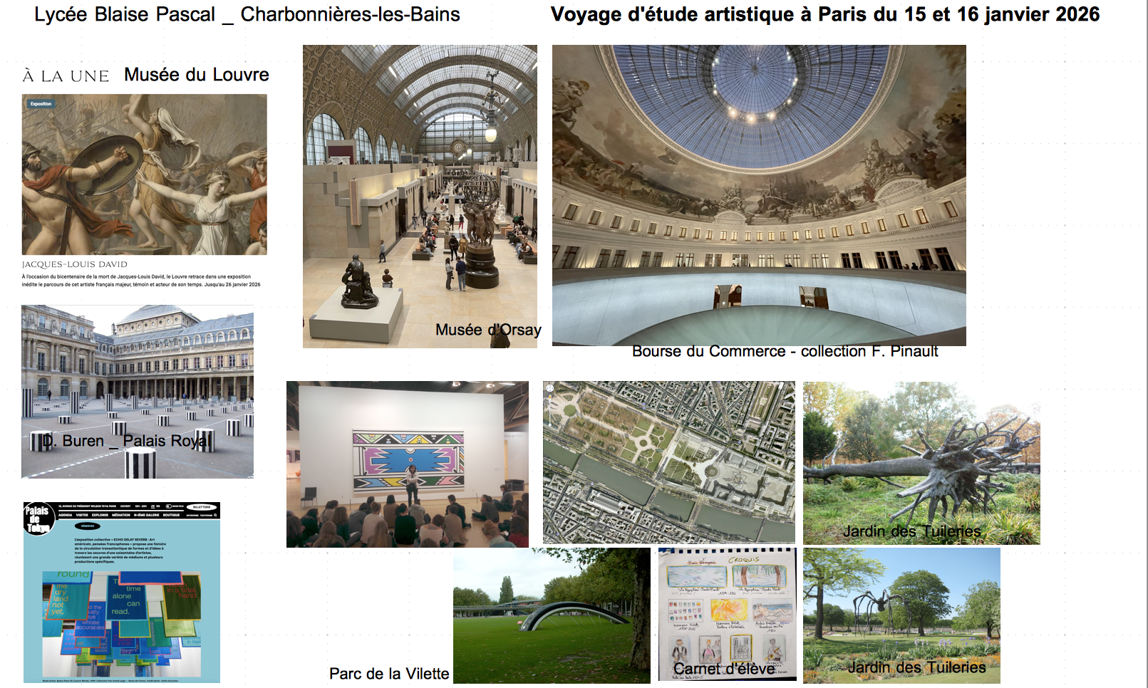 Les élèves de seconde, de première et de terminale qui ont choisi la spécialité ou l'option arts plastiques envisagent, avec leurs professeurs, de découvrir cette année les lieux emblématiques de la capitale qui sont en lien direct avec les œuvres et questionnements étudiés en cours : le Louvre, le Palais Royal avec l'intervention in situ de Daniel Buren dans la cour d'honneur, le jardin des Tuileries qui mène au musée de l'Orangerie, la passerelle qui nous fait rejoindre le musée d'Orsay, le Palais de Tokyo et le MAMVP, la Bourse du Commerce et le quartier Beaubourg.