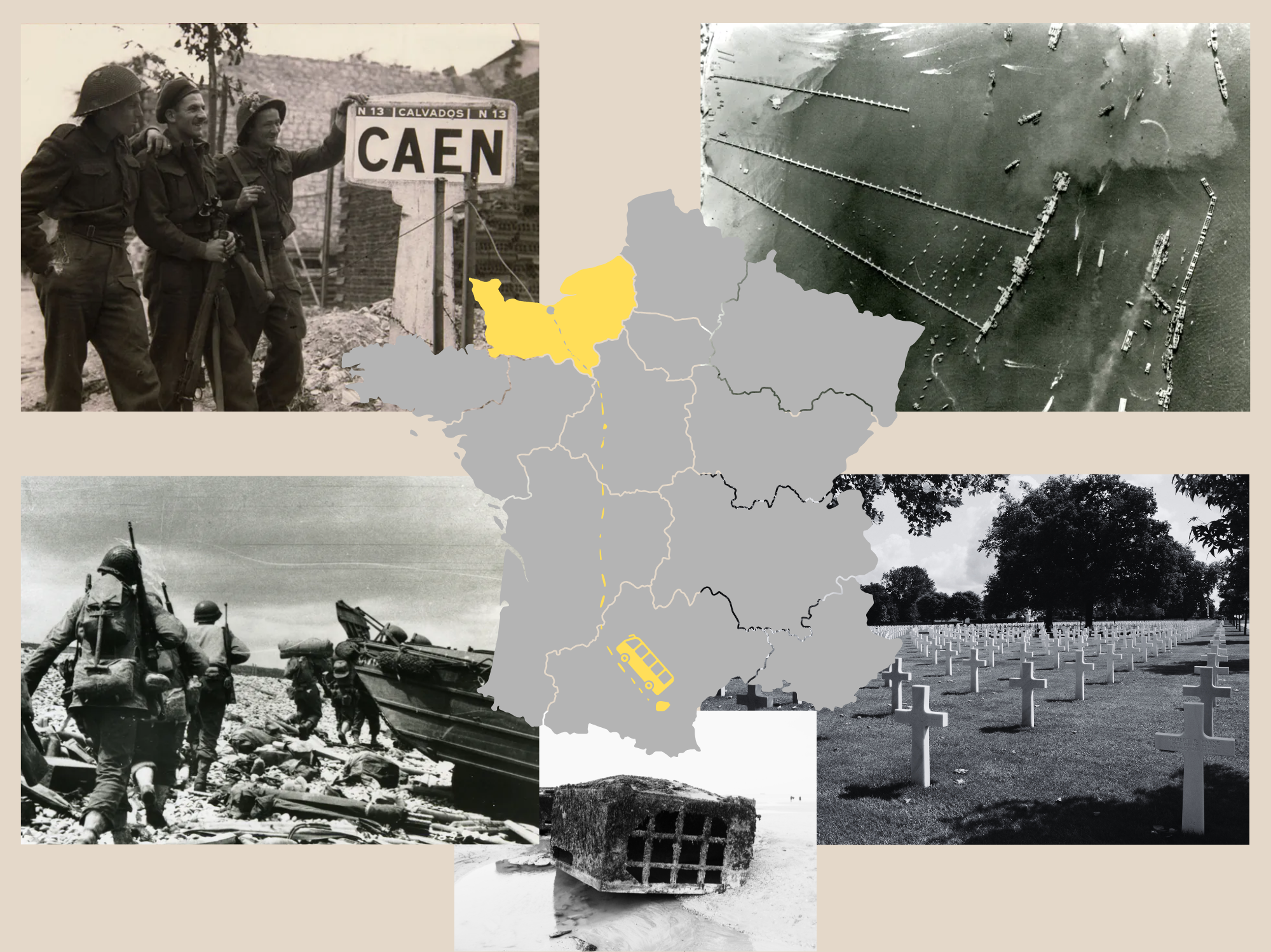 Jour 1 : Départ à 20h30 de l’établissement. Arrivée à Caen vers 09h00 (jour 2), Visite guidée du Mémorial de Caen, installation à l'hébergement, dîner et nuit. Le lendemain (jour 3) : Les Plages du Débarquement, Circuit guidé des Plages du Débarquement : la batterie allemande de Longues sur Mer, le cimetière américain de Colleville-sur-mer, Omaha Beach… L’après-midi, visite libre du Musée Mémorial Pegasus Bridge., retour à l'hébergement, dîner et nuit. Jour 4 : visite libre du Musée du Débarquement puis découverte libre du port artificiel d'Arromanches. Retour à l’établissement avec une arrivée vers 01h00 (jour 5).