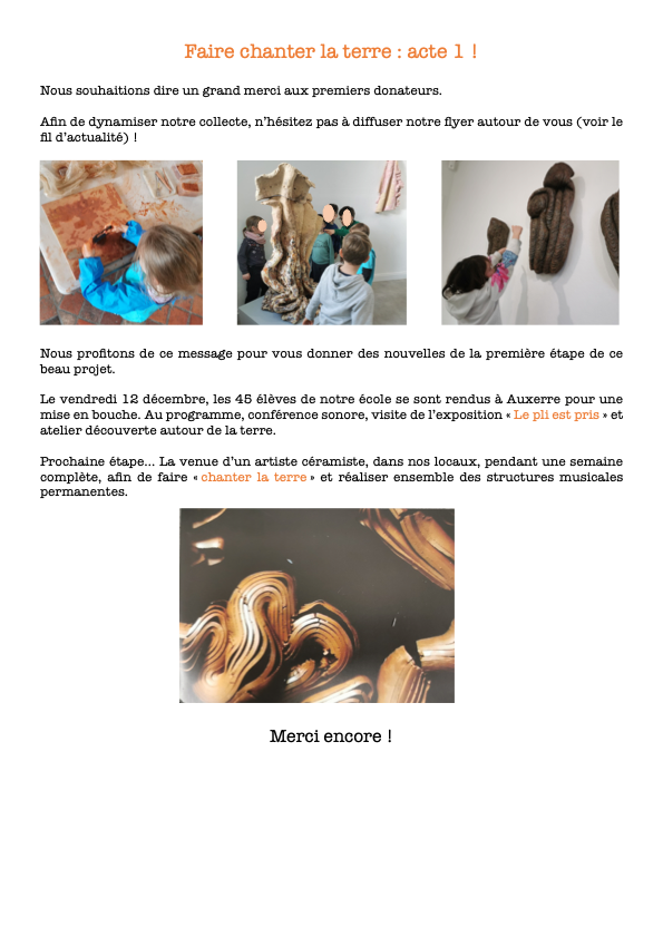 Le projet est amorcé par une journée à Auxerre le 12 décembre à la galerie Hors Cadre. Lors de cette sortie, une demie journée sera consacrée à la visite guidée de l’exposition « le pli est pris » par Virgile Loyer, artiste présent dans l’exposition, pendant que les enfants feront en roulement un premier atelier de céramique. L’autre demie journée fera l’objet d’une sensibilisation à l’art sonore par l’artiste Nicolas Bralet (conférence et initiation).