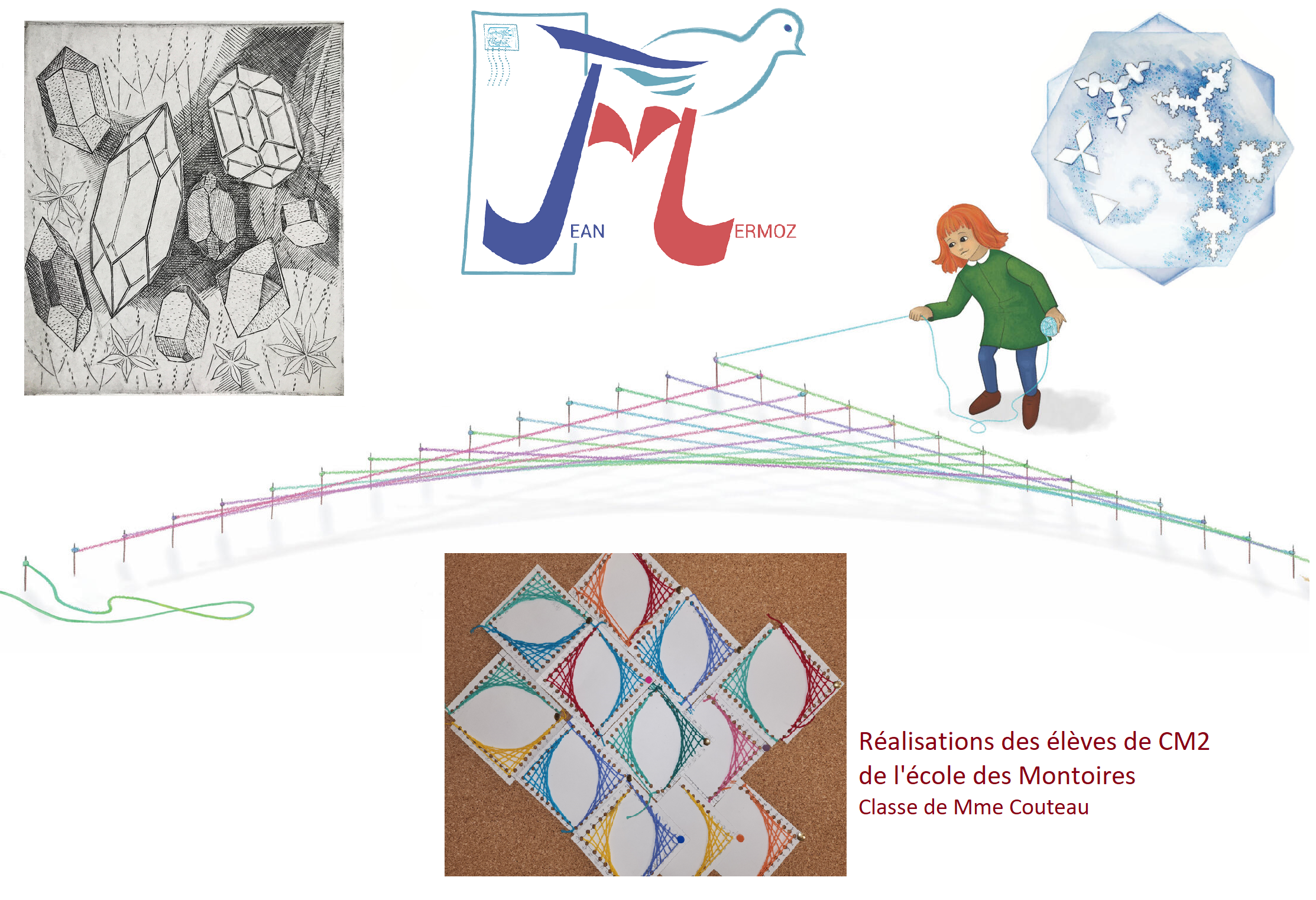 Nous avons pu lire "Conte tout droit" et "La faiseuse de neige" pendant certains « quart d’heure lecture », puis travailler en mathématiques sur des figures qui sortent de l’ordinaire comme des paraboles, hyperboles et ellipses faites avec des droites, des flocons fractales découpés aux ciseaux…