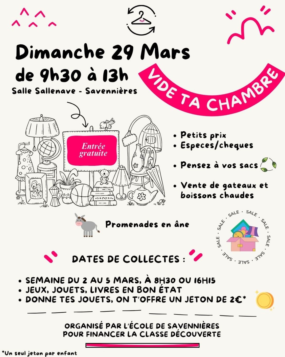 Les élèves, toujours pleins d’idées, ont lancé une nouvelle initiative : un "Vide ta chambre" ! Réunis en conseil de délégués avec le directeur de l’école, ils ont imaginé cette action pour récolter des fonds supplémentaires et animer le marché de la commune un dimanche matin. Un groupe de parents s’est ensuite constitué pour organiser cet événement.