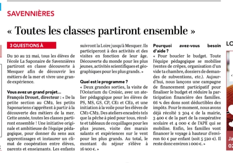 Du 20 au 22 mai, les enfants de Savennières suivront la Loire jusqu'à Mesquer. Ils participeront à des activités et des visites choisies en fonction de leur âge. Découverte du monde pour les plus jeunes, activités scientifiques et géographiques pour les plus grands.