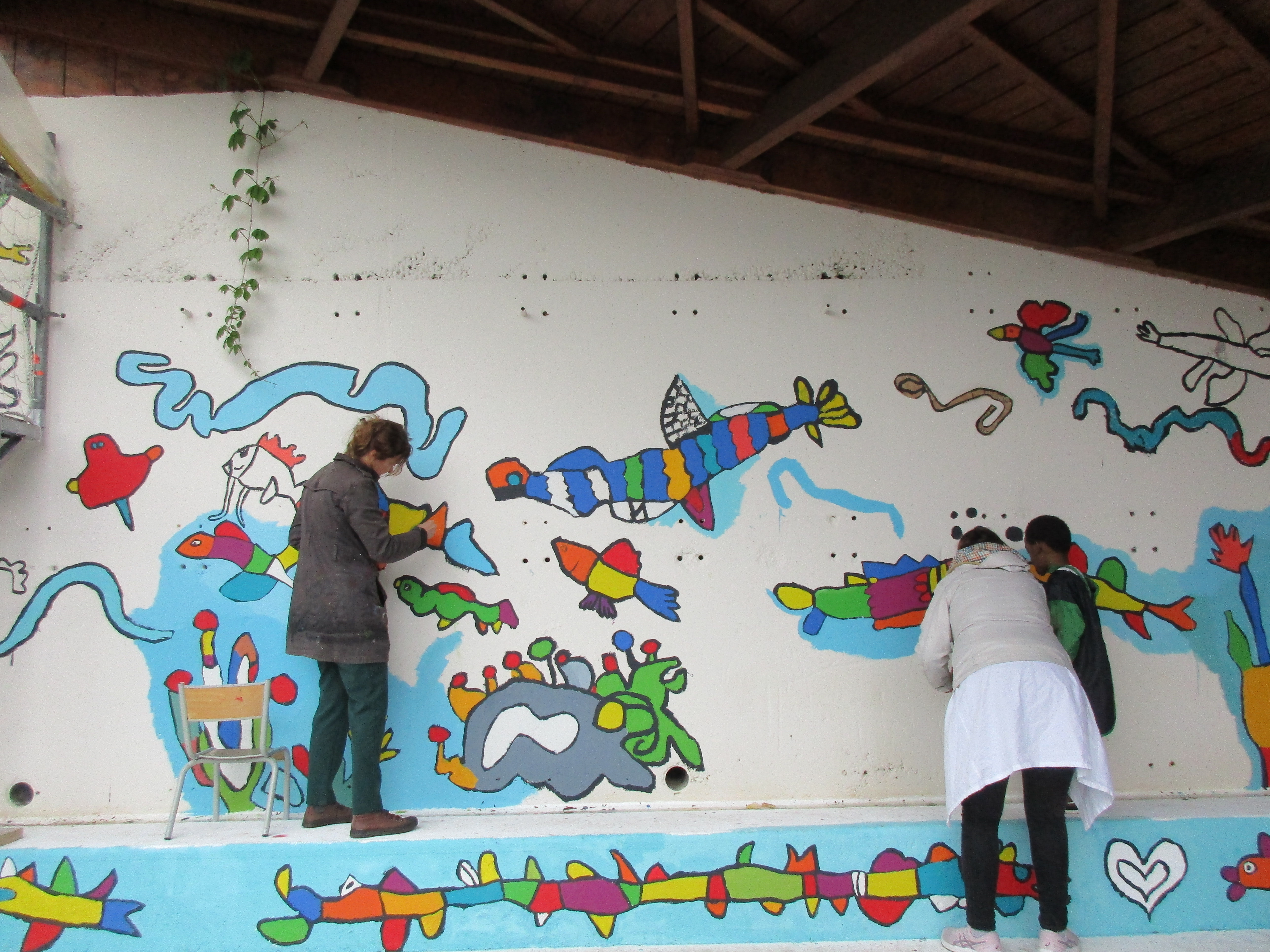2) Deuxième temps : mise en peinture des éléments de la fresque sur le mur (+ les retouches) du 27 avril au 12 mai.