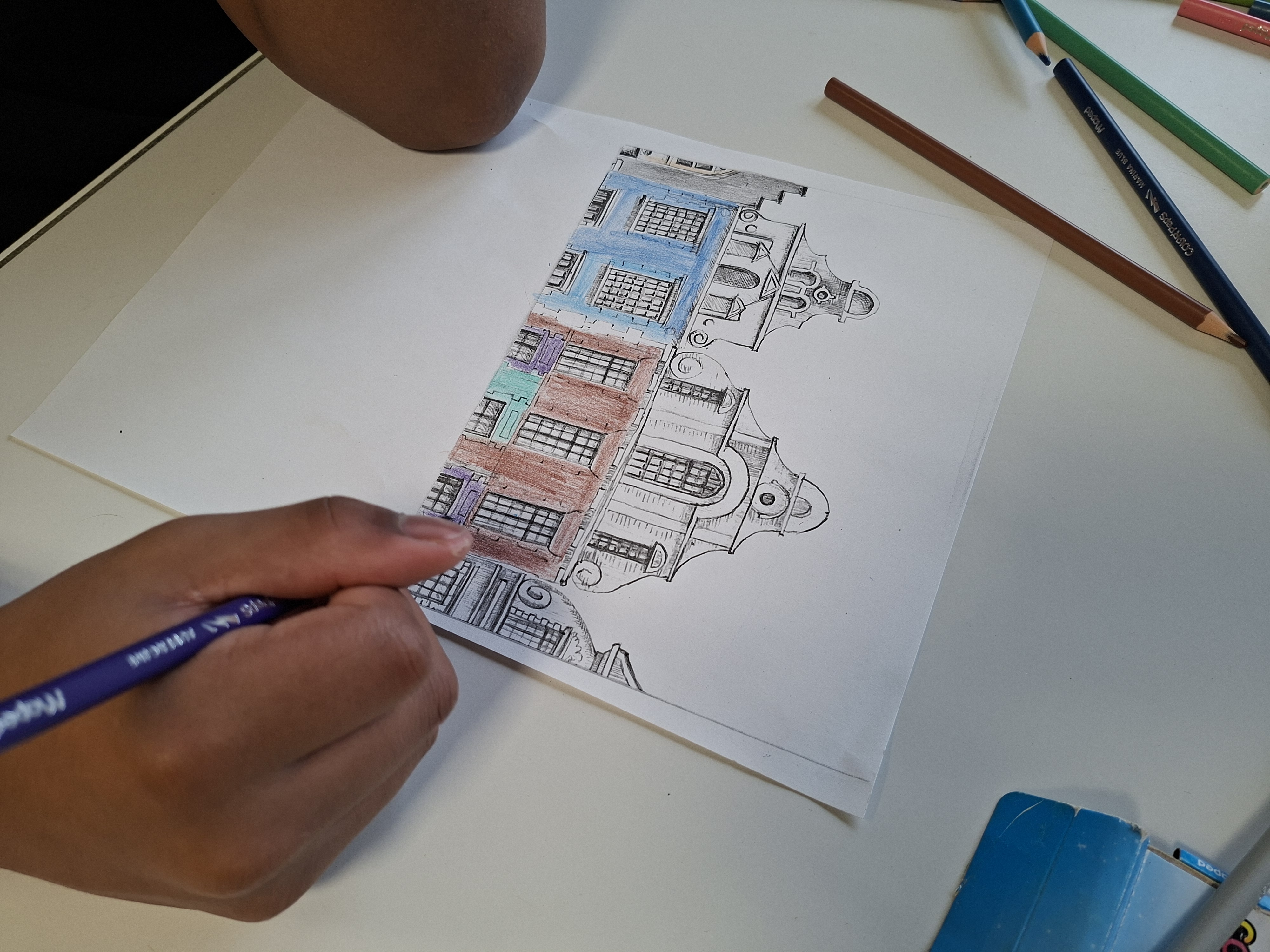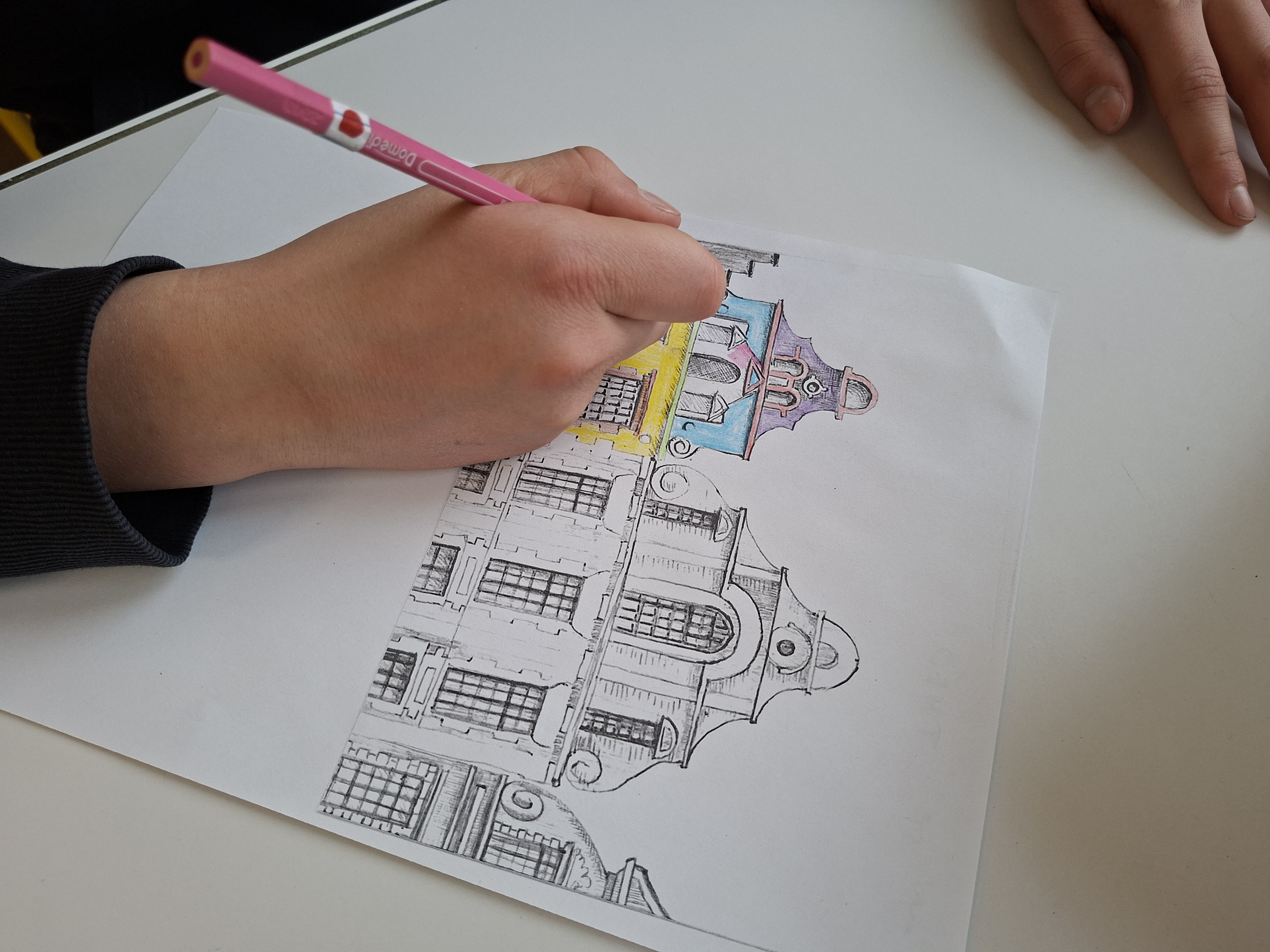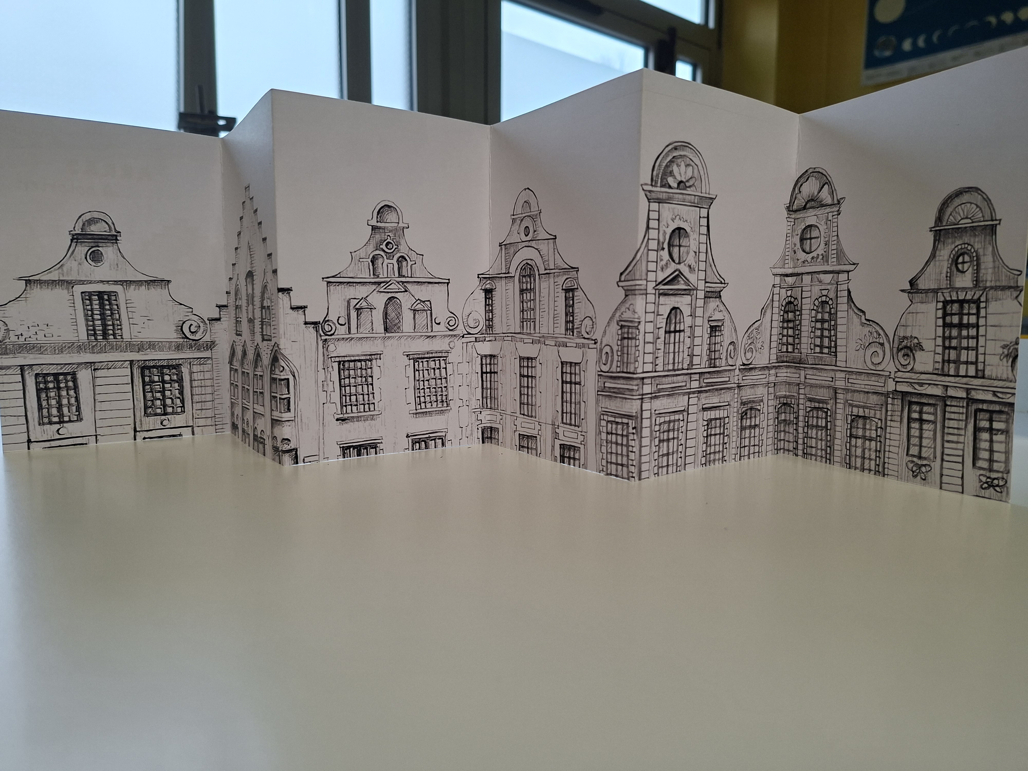 Lors d'une première séance, à partir du dépliant "Arras ... à colorier", nous avons colorié les façades des maisons présentes sur la place de la ville d'Arras.