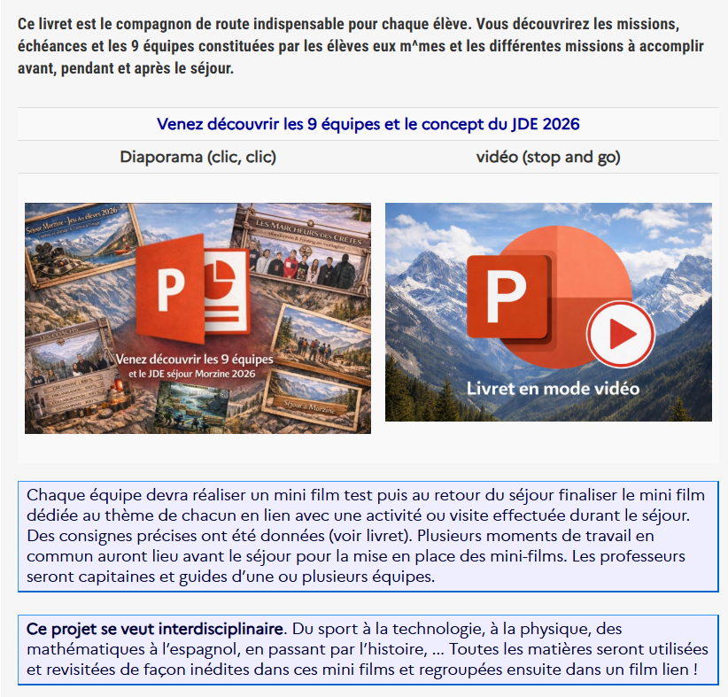Bonjour à tous, les élèves vont préparer les cartes de visites et plaquettes information pour la Trousse à projet. Une réunion à lieu ce lundi 12 janvier 2026 pour metre en place le projet et constituer les 9 équipes pour " Le jeu des élèves 2026®". La programmation du travail avant, pendant et après le séjour permettra d'avoir une vue d'ensemble du projet. Vous arez des informations au fur et à mesure de l'avancée du projet.