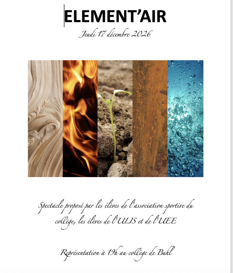 Un projet mené par le collège et l'UNSS Ainsi les élèves des AS danse et artistiques, de l'UEE et de l'ULIS travailleront ensemble pour proposer un spectacle sur le thème des quatre éléments.