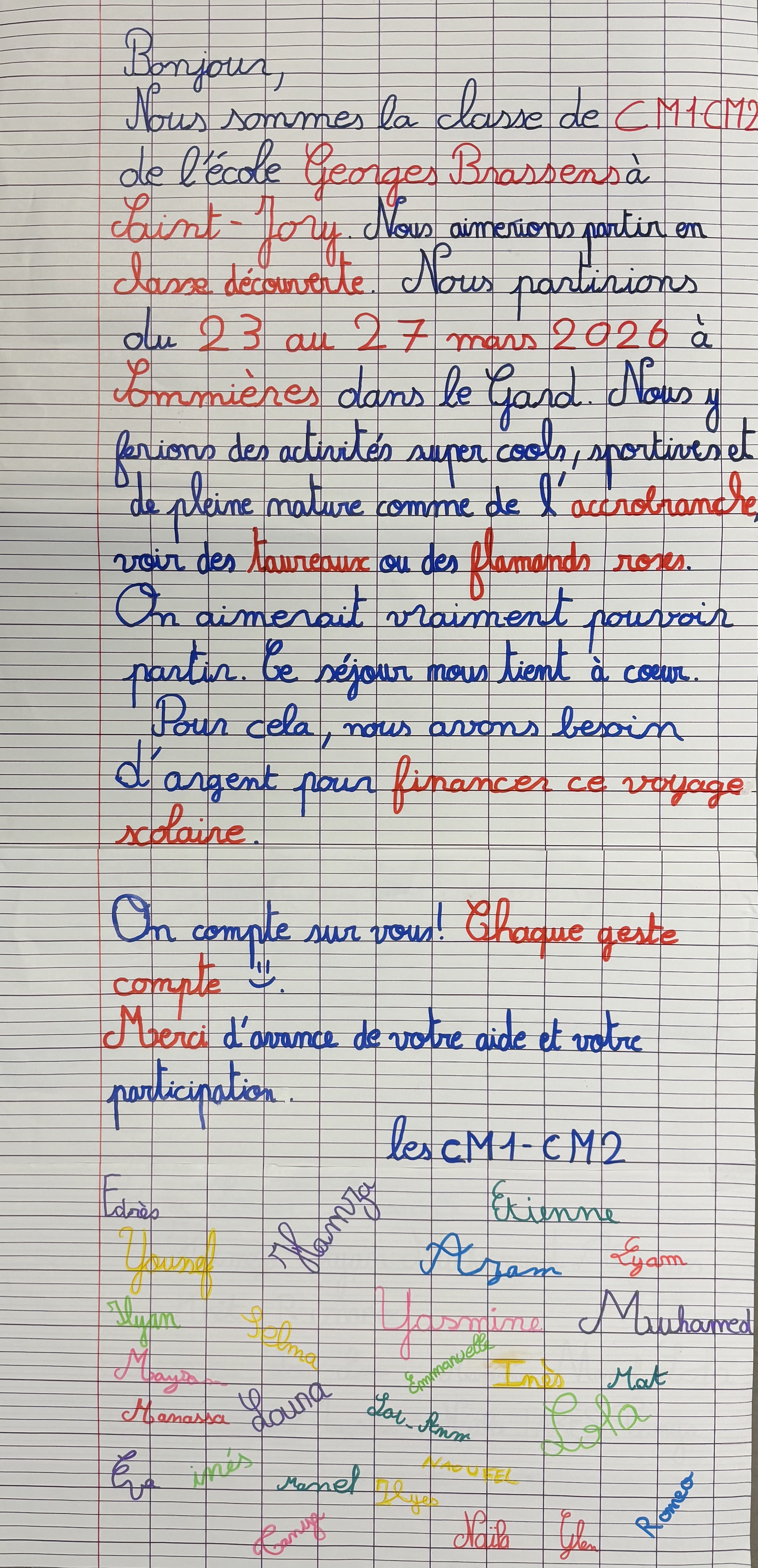 Les enfants et nous, leur maîtresse, vous remercions énormément de votre aide, votre soutien, tout ce qui nous aidera à financer une partie de ce séjour si cher à leurs cœurs...