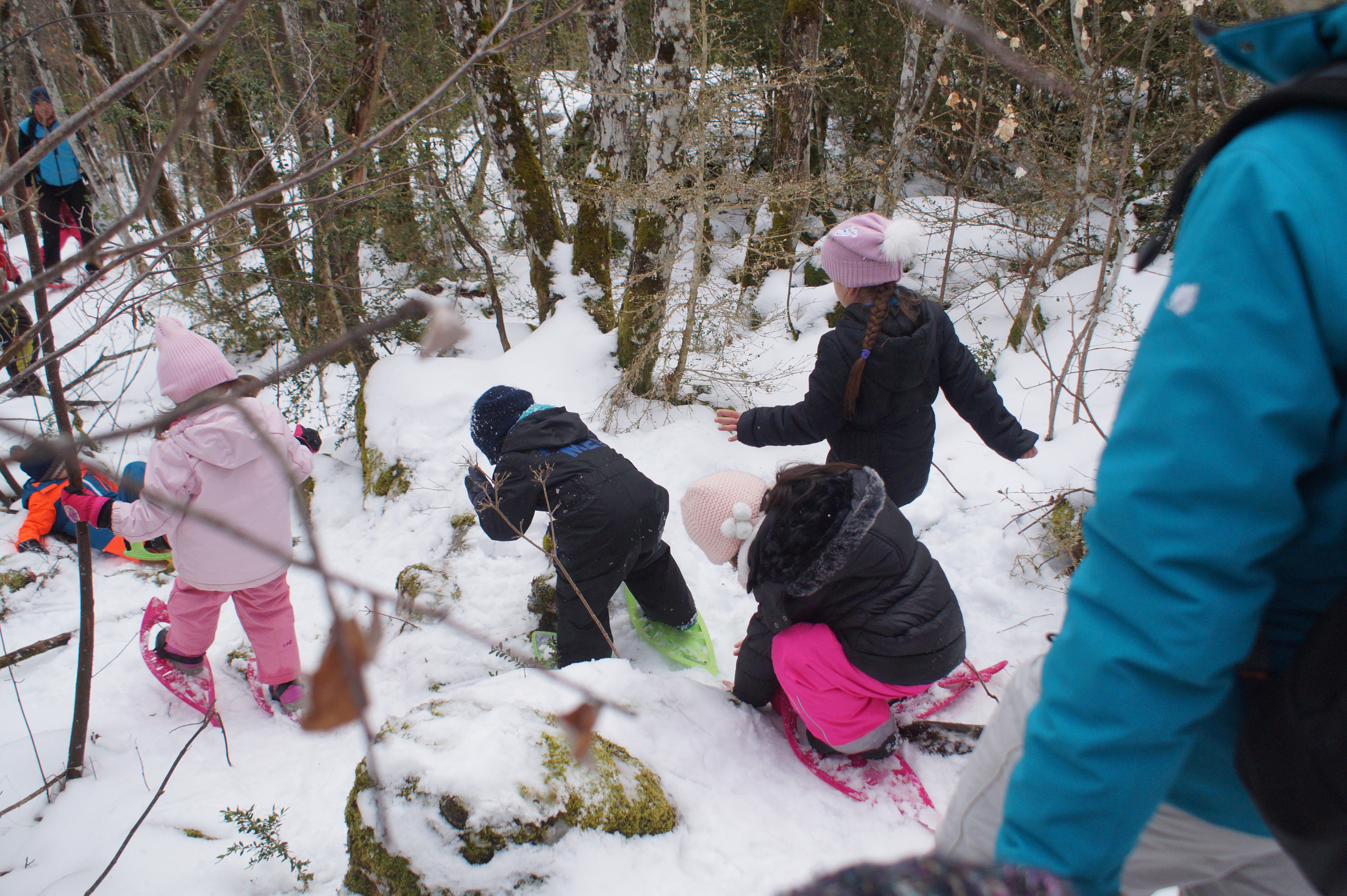 Grâce à une promenade en raquettes dans la neige , nous avons découvert les empreintes des animaux au sol et dans les arbres et comment les animaux et les végétaux passent l'hiver.