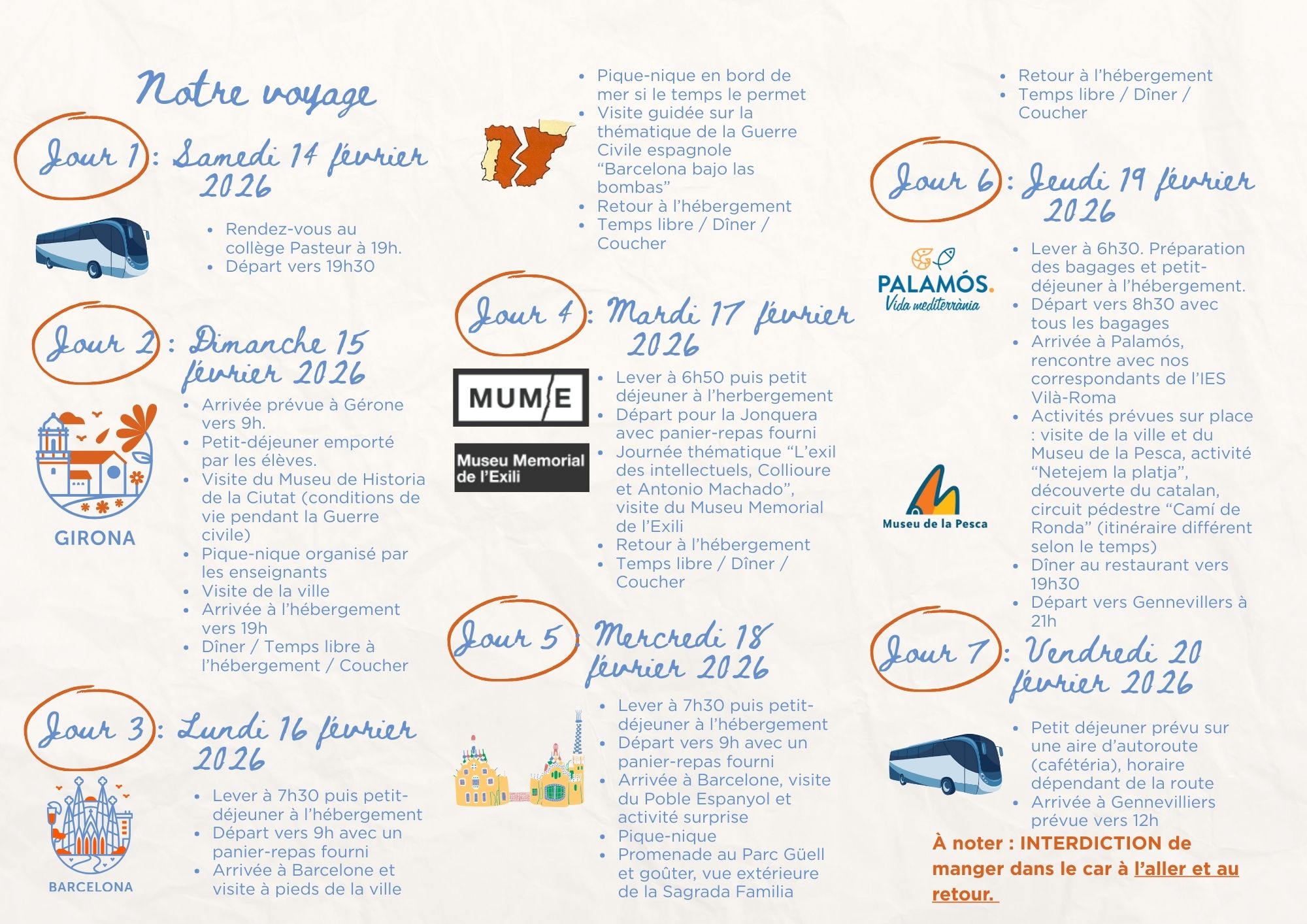 De longues heures de bus nous attendent jusqu'à Gérone, pour notre première étape. Après une visite du Musée de l'Histoire de la Ville pour voir comment la guerre civile espagnole a impacté la population catalane, mais aussi pour découvrir des spécificités de la région comme la sardane, c'est parti pour une course d'orientation urbaine, avec une petite surprise à la clé! Nous rejoindrons ensuite notre hébergement.