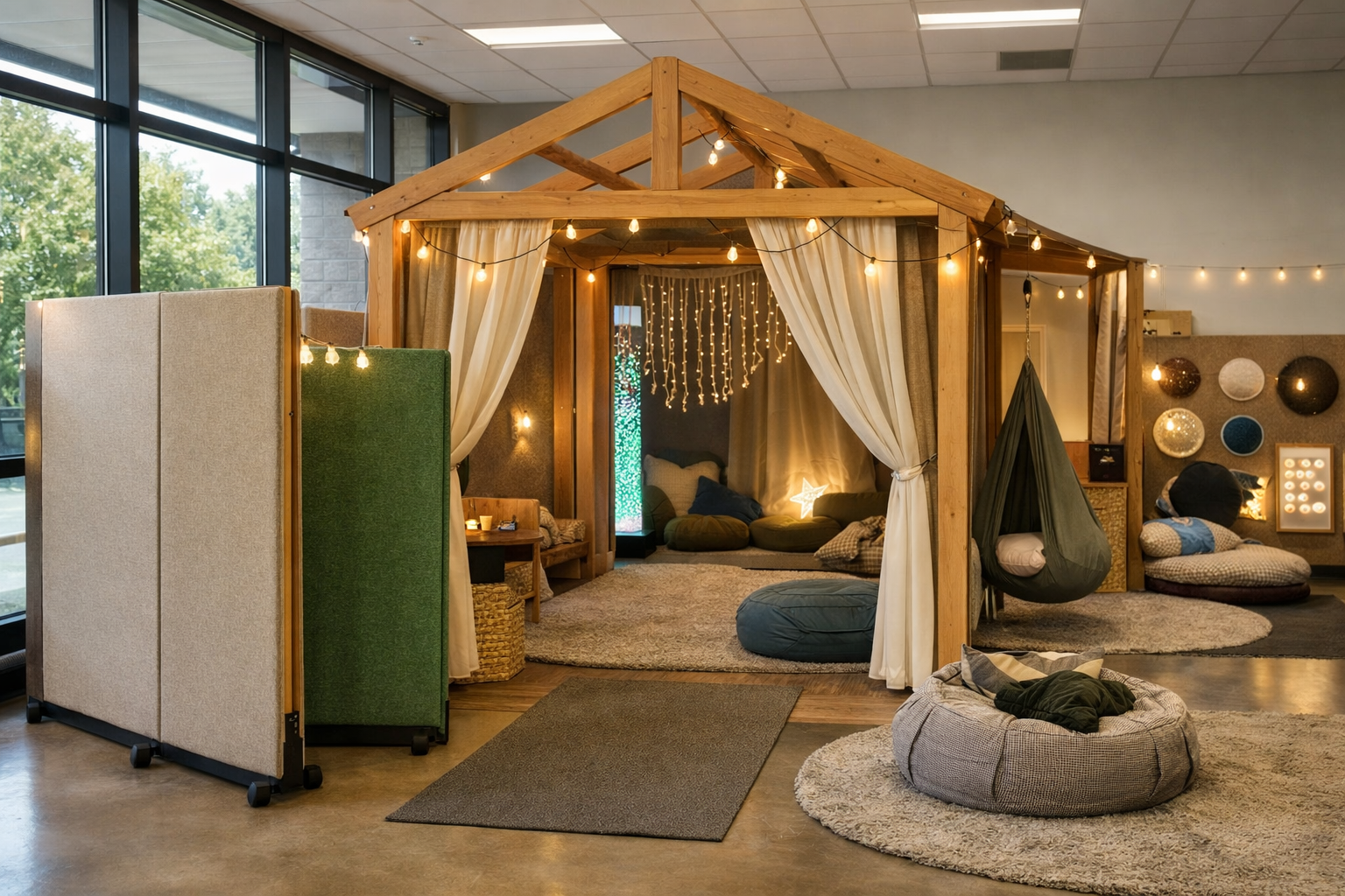 La Ruche est une salle vaste. Or, pour certains élèves (notamment avec TSA, hypersensibilités, troubles attentionnels), un grand espace peut être source d’insécurité sensorielle : trop de stimulations visuelles, trop de “vide”, difficulté à se repérer et à s’apaiser.