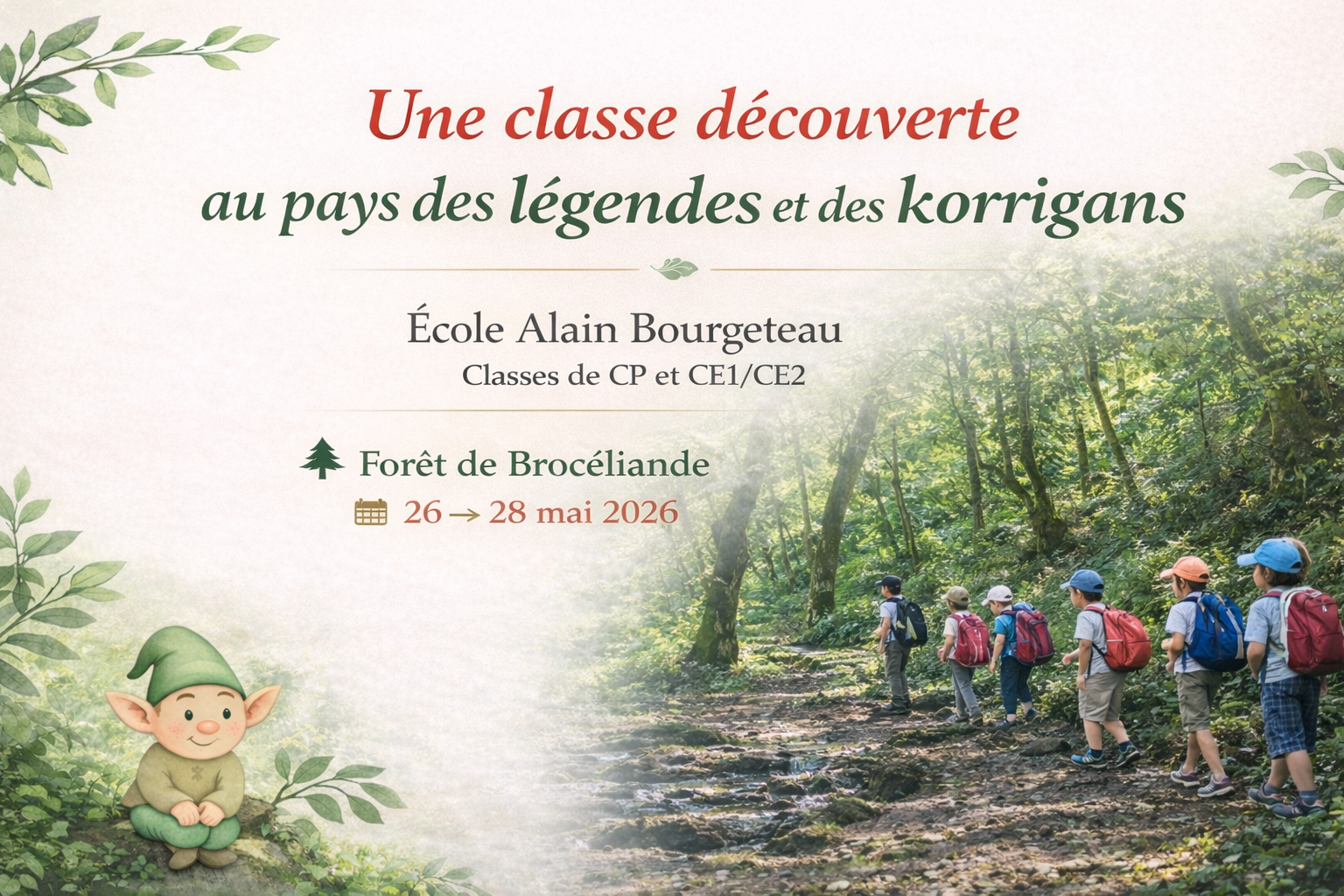 Le séjour se déroulera du 26 au 28 mai 2026 au CPIE Forêt de Brocéliande. Après plusieurs mois de préparation en classe autour du conte, les élèves vivront trois jours d’immersion en pleine nature. Au programme : randonnée contée au Val Sans Retour, découverte des légendes arthuriennes, ateliers « Univers des korrigans » et « Dans la peau d’un korrigan » pour inventer un personnage, jeux sensoriels en forêt et création collective d’un village imaginaire. Une veillée contée viendra clôturer l’une des journées, dans un moment de partage et d’écoute privilégié.