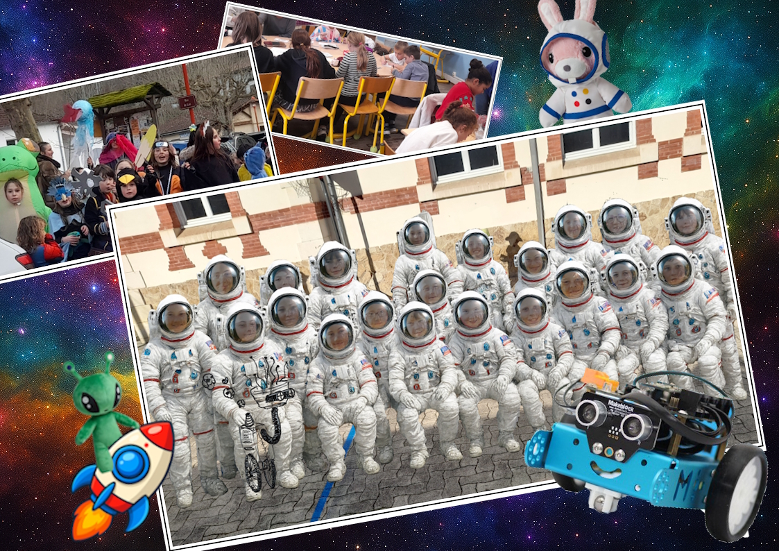 Nous avons ainsi pu explorer cette thématique à travers de nombreuses disciplines (le système solaire , les objets techniques -les robots- et la programmation en sciences ; la science-fiction en littérature et en production d’écrit ; la conception de robots-maquettes et d’univers bariolés en arts ; la création d’une chorégraphie futuriste en E.P.S. ; le journal de bord des mascottes extraterrestres de chaque classe …)