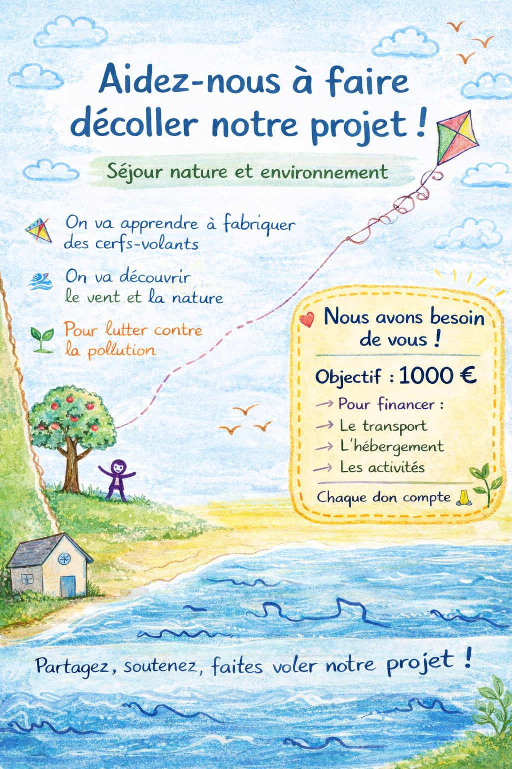Nous aimerions partir en séjour de classe transplantée à Biscarosse. Nous partirons la première semaine de juin (du 1er au 5 juin). Nous partirons en train. Nous allons apprendre des choses sur l'air, la nature.. Le montant total à financer est de 6 621€. Pendant ce séjour, nous ferons des activités (fabrication de cerf-volant, de fusées à hydrogène..). L'objectif est de changer de paysage, de voir l'océan Atlantique.. Cela permettrait de développer nos responsabilités et notre autonomie mais aussi de travailler en groupe. Nous rentrerons avec les mêmes moyens qu'à l'aller. Ce séjour sera super!