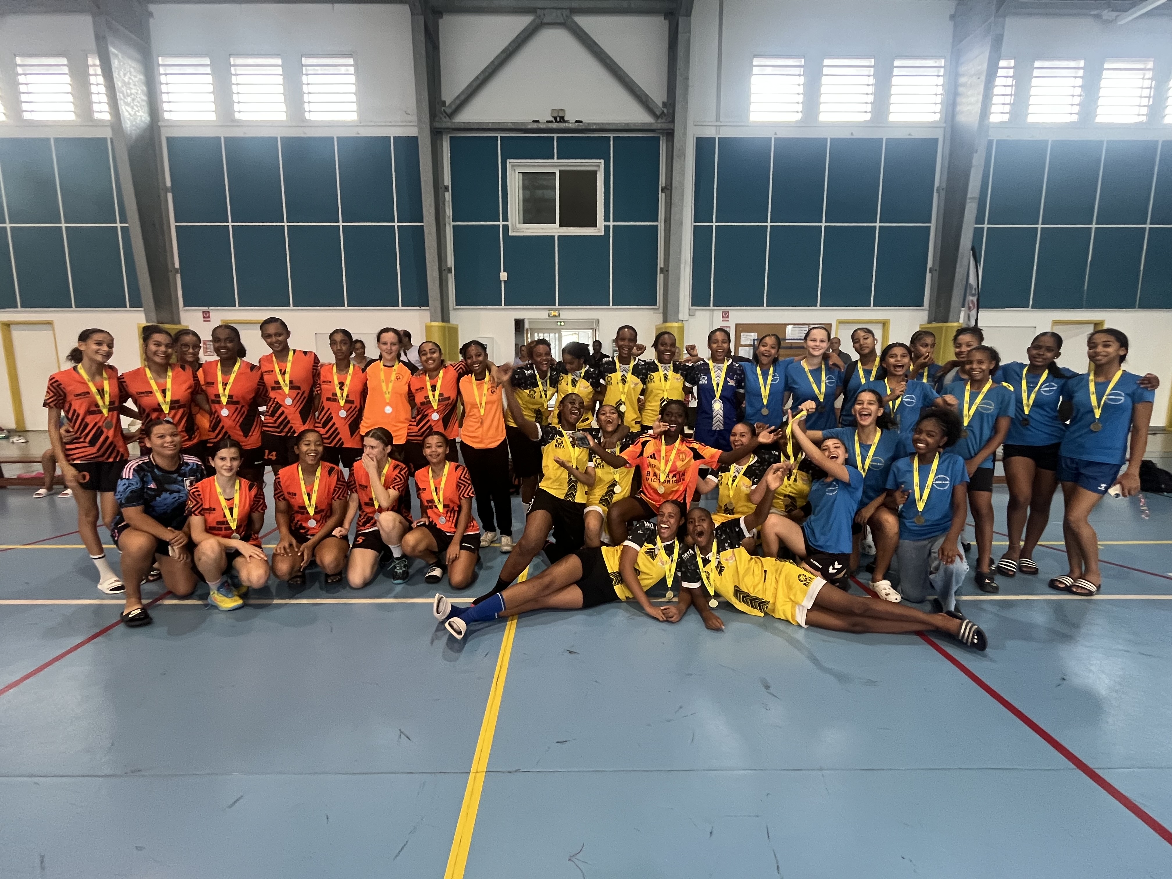 L'équipe MF de la Section Sportive Handball composée de 13 filles: 11 joueuses, 1 jeune coach et 1 jeune arbitre issue du collège de Bourbon (REP +) situé à Saint-Denis 97400 (La Réunion), accompagné par 2 enseignants d'EPS et de leur coach en club.