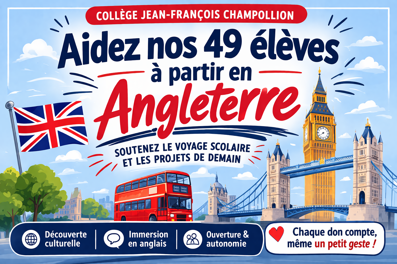 Les élèves participeront à un voyage scolaire en Angleterre, avec notamment la découverte de Londres et de ses lieux emblématiques. Au programme : visites culturelles, immersion linguistique et activités pédagogiques permettant de pratiquer l’anglais dans des situations concrètes. Ce séjour vise à développer les compétences linguistiques des élèves, leur autonomie, leur ouverture culturelle et la cohésion du groupe.