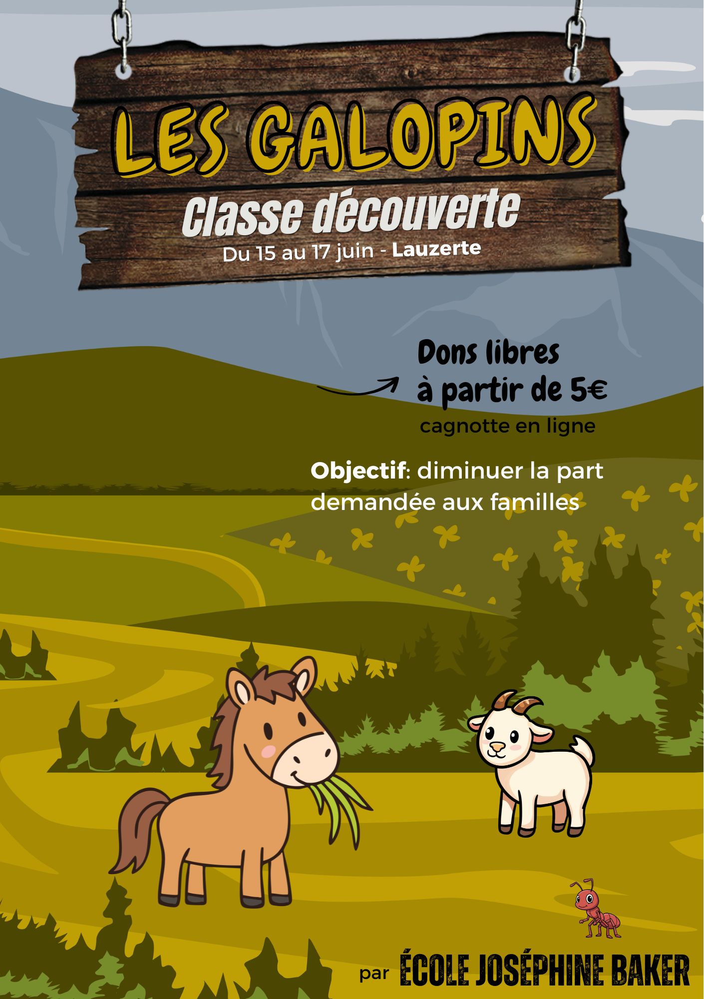 Aidez les classes E1 et E5 de l'école Joséphine Baker à partir s'initier à l'équitation et découvrir le milieu rural.